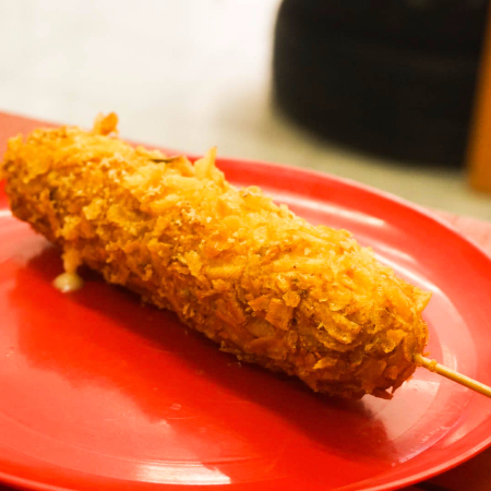 Banderilla de slachicha y queso gouda, cubierta de masa y el topping de tu elección. Frita y crujiente
