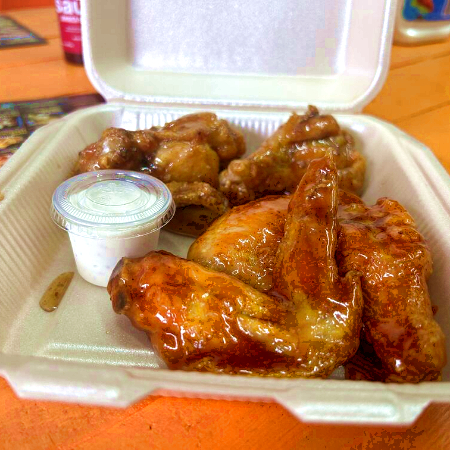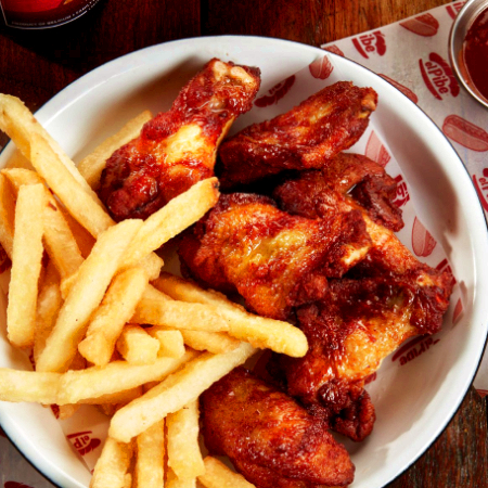 Orden de seis alitas de pollo fritas y bañadas con la salsa de tu elección