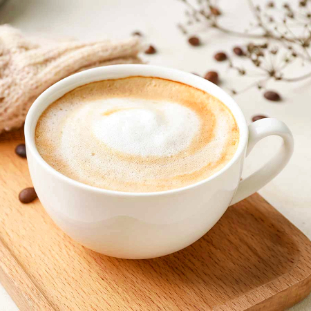 Doble shot de espresso, con leche y espuma de leche, en vaso de 240 ml.