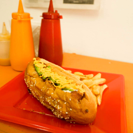 Salchicha jumbo, tocino en trocitos, crema, aguacate y queso amarillo en pan brioche