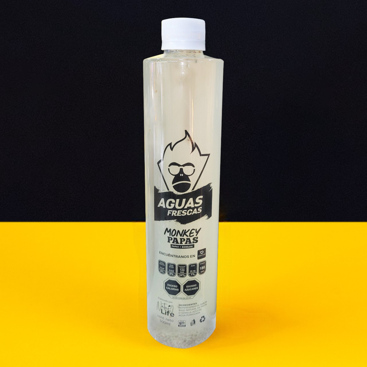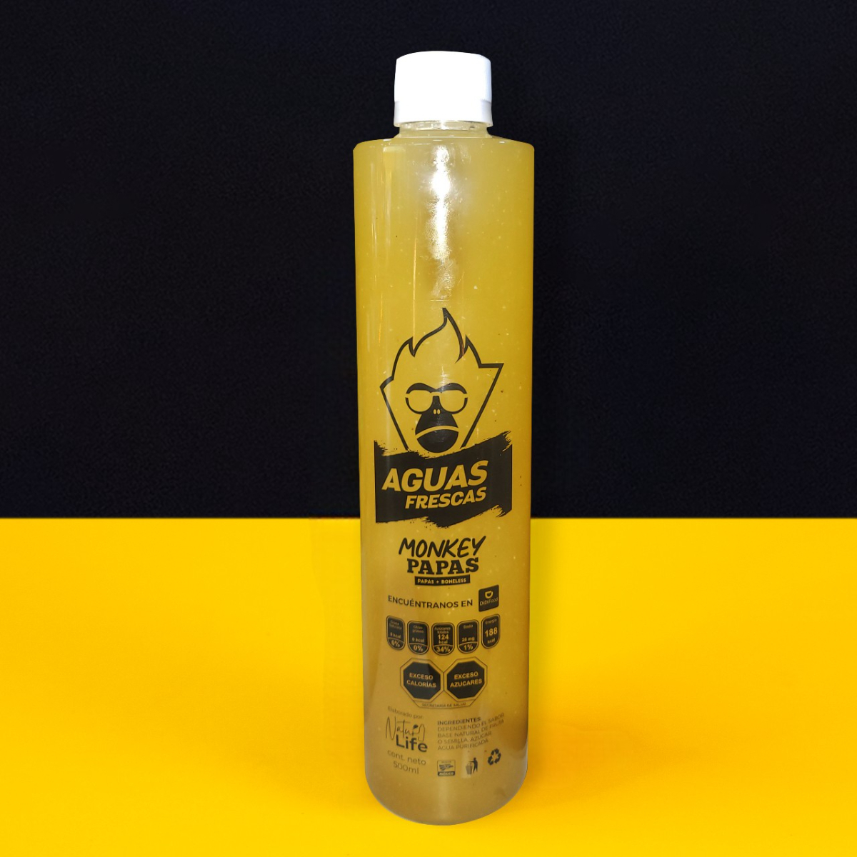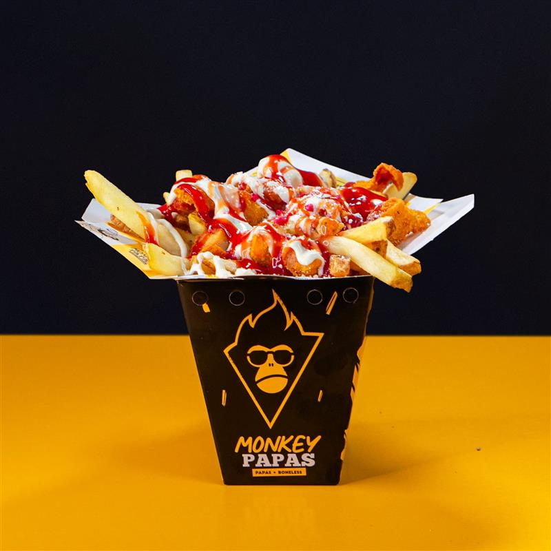Caja con papas a la francesa fritas en la parte de abajo (180g) y Boneless de pollo en la parte de arriba (120g)