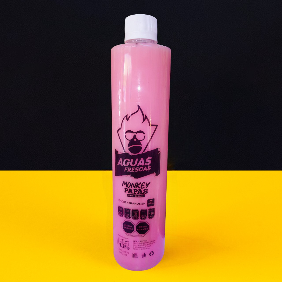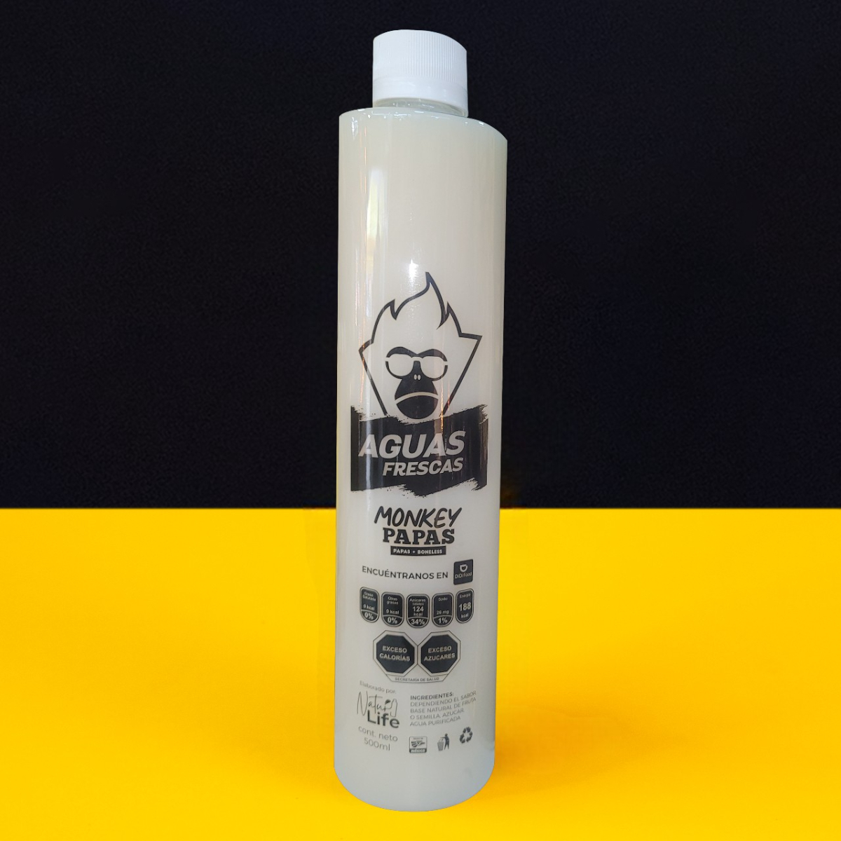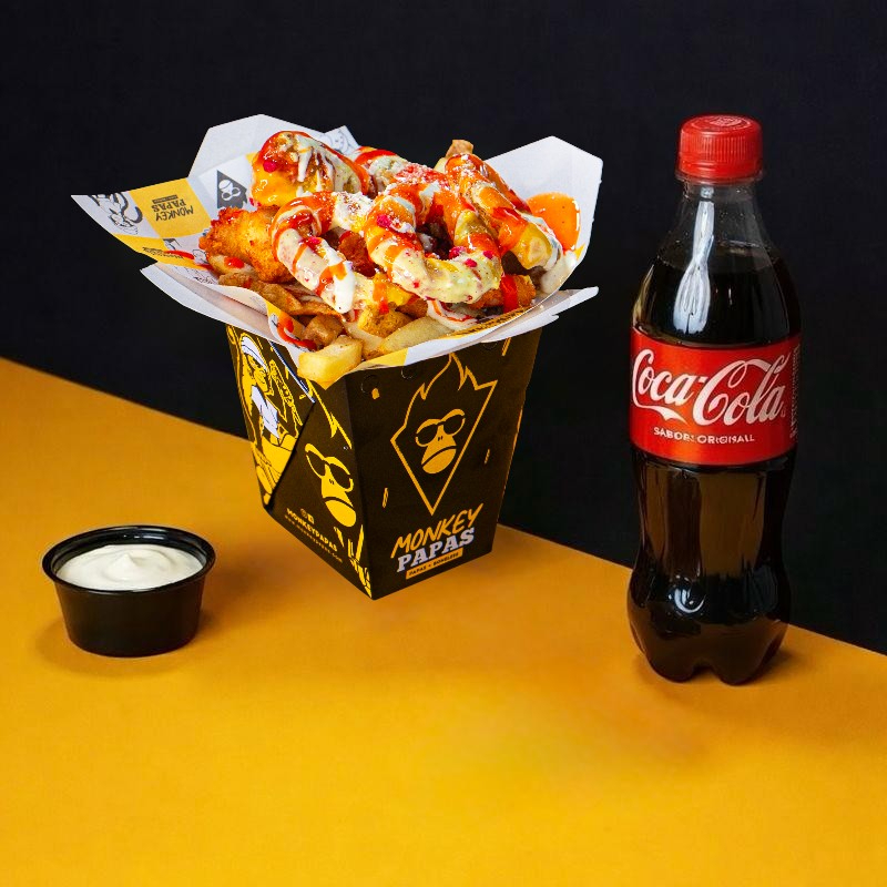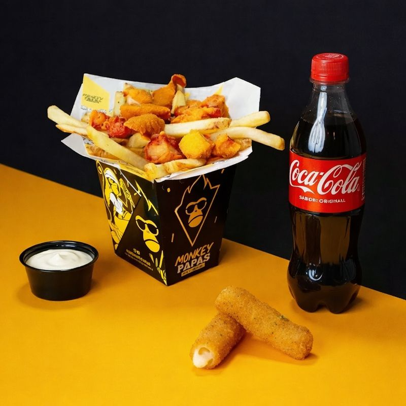 Caja con 55 gramos de trocitos de pollo y 115 gramos de papa a la francesa dorada.