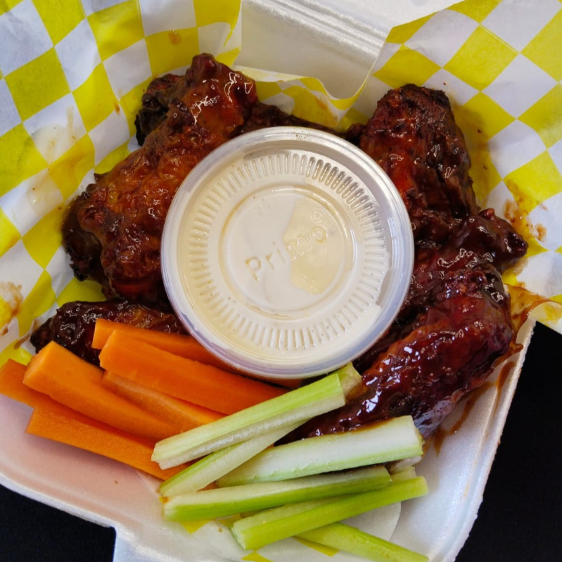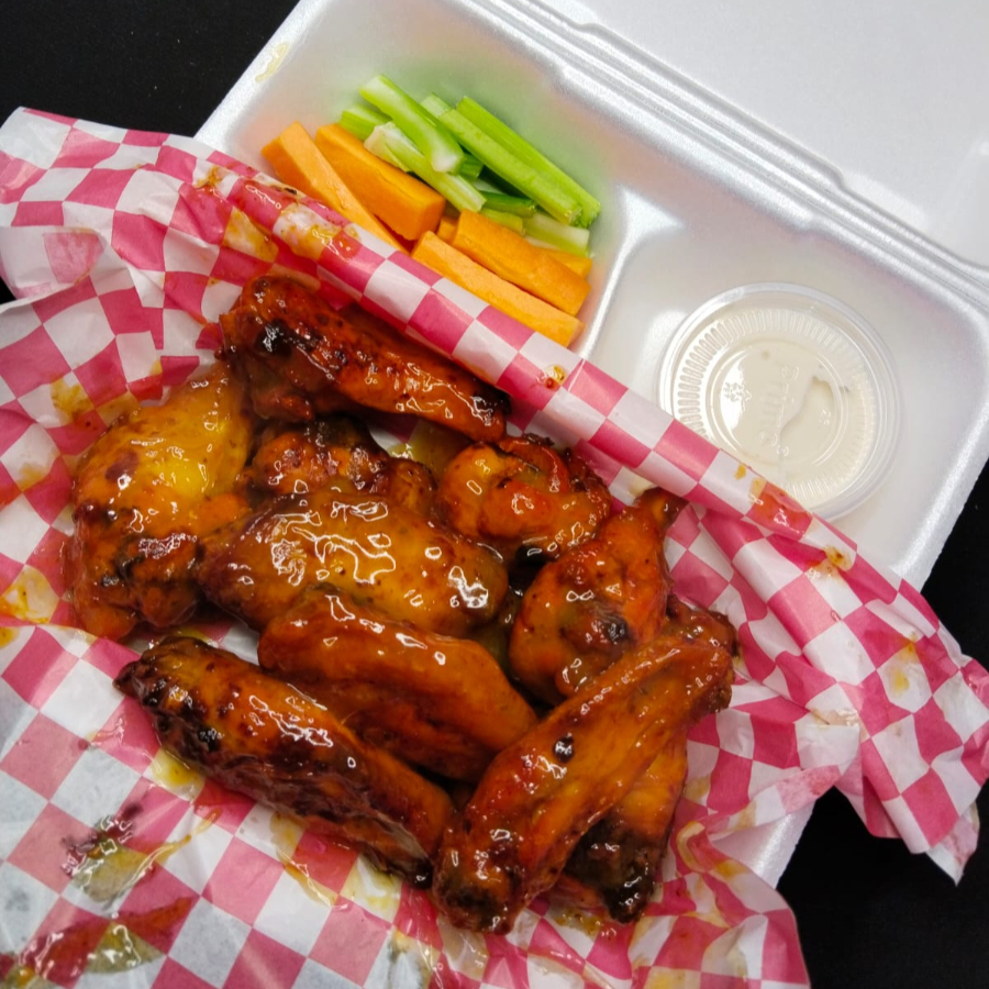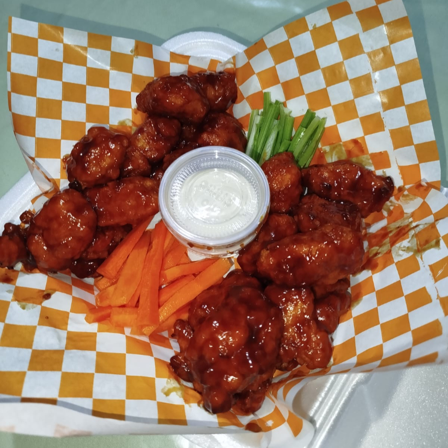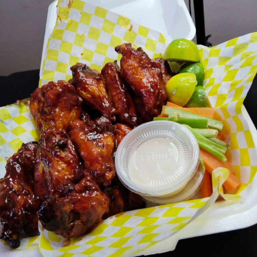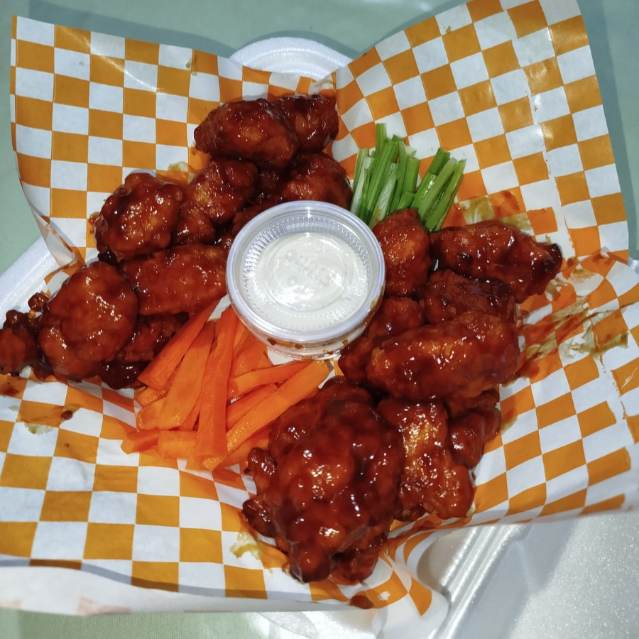 Alitas bañadas en salsa de su preferencia acompañado de zanahoria apio y aderezo