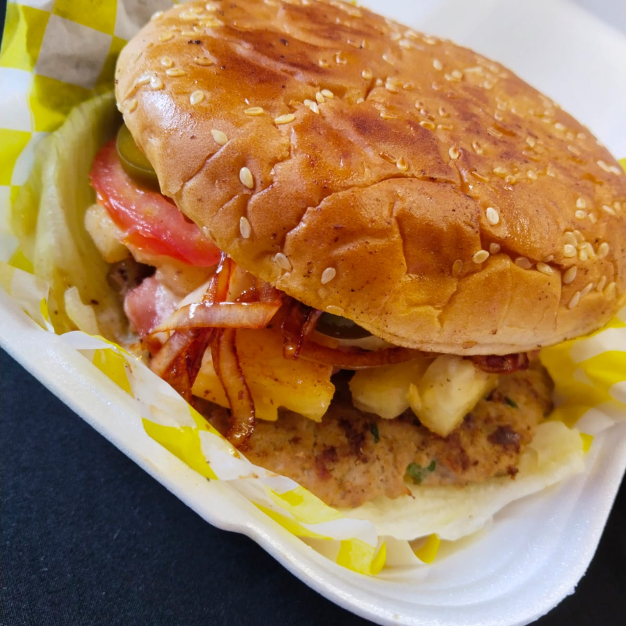 Carne de res, queso amarillo, queso oaxaca, jamón, piña, jitomate, cebolla lechuga y mayonesa.