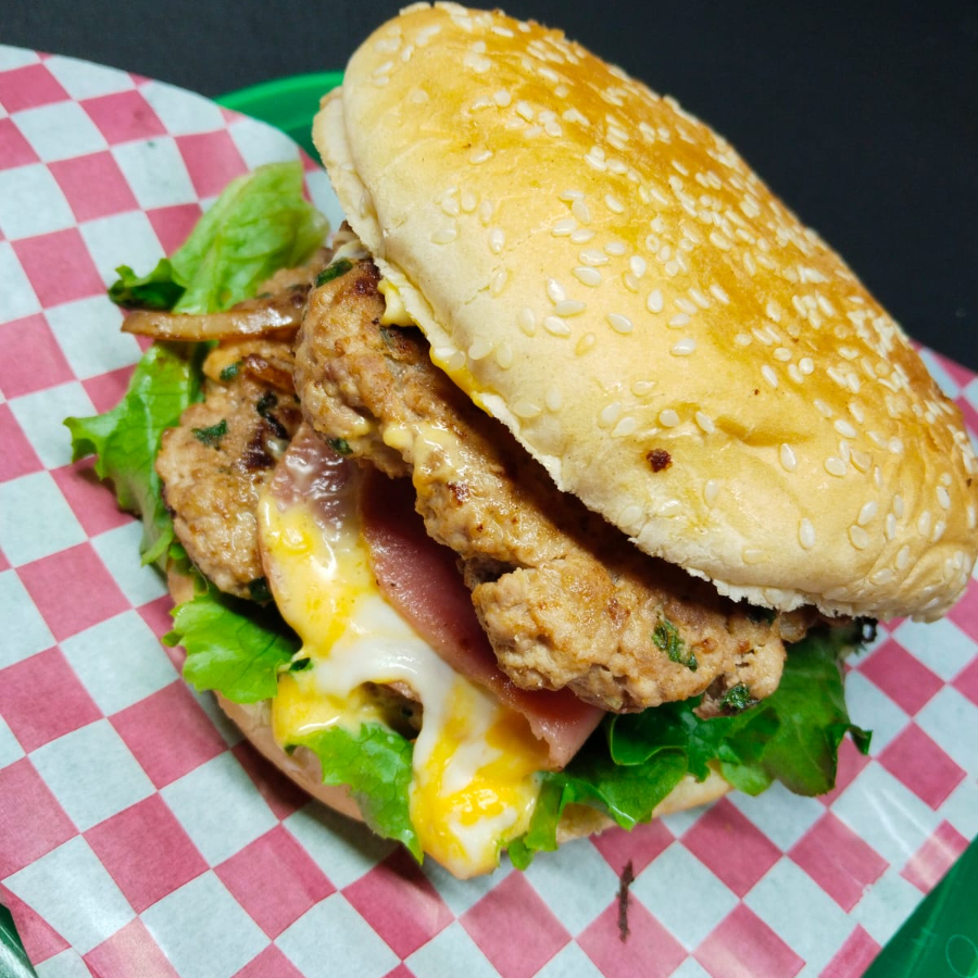 Doble carne de res, queso amarillo, queso oaxaca, jamón, jitomate, cebolla lechuga y mayonesa.