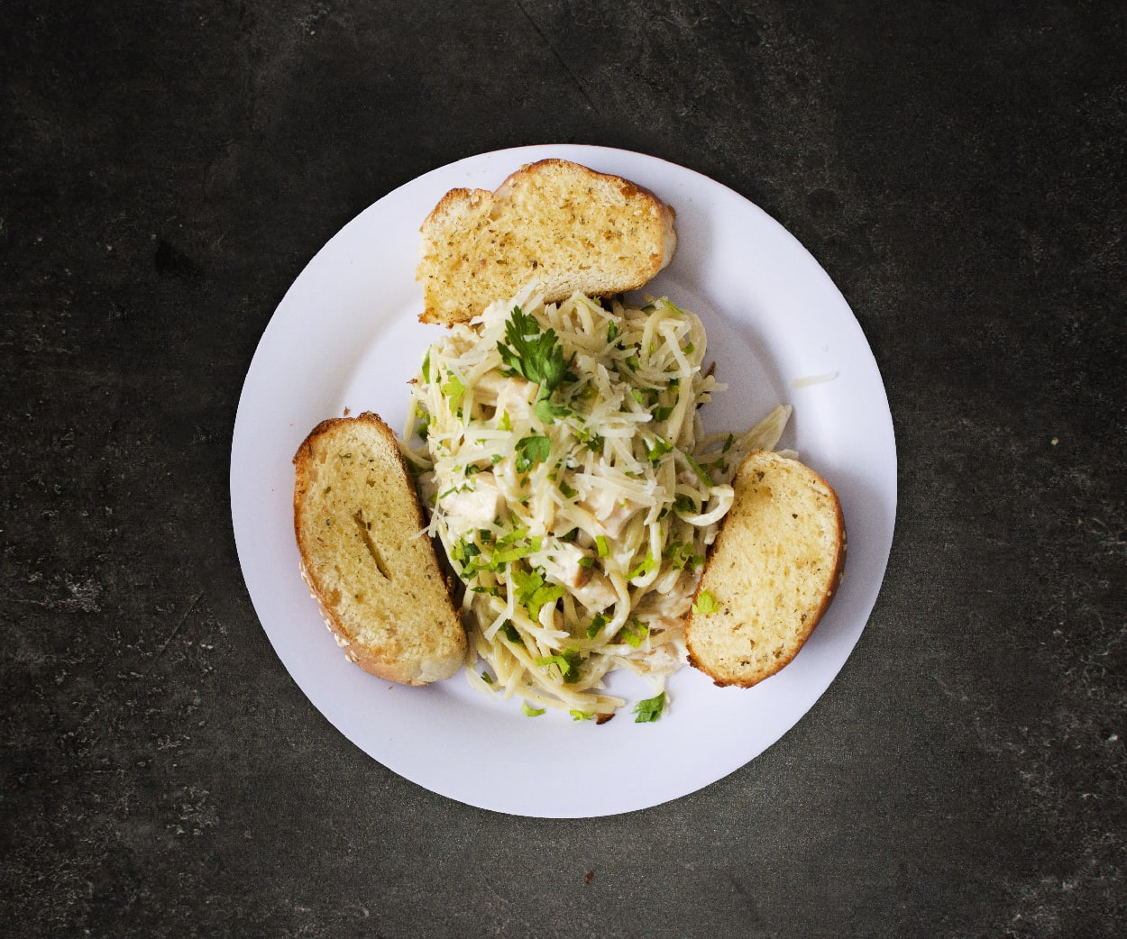 Aromática pasta con albahaca, ajo parmesano, queso parmesano y mantequilla. Acompañado de rico pan horneado.