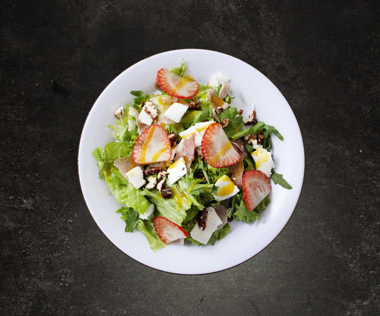 Ensalada gourmet a base de lechuga, arúgula baby, jamón serrano, queso de cabra, nuez garapiñada, vinagreta, mostaza-miel y fresa.