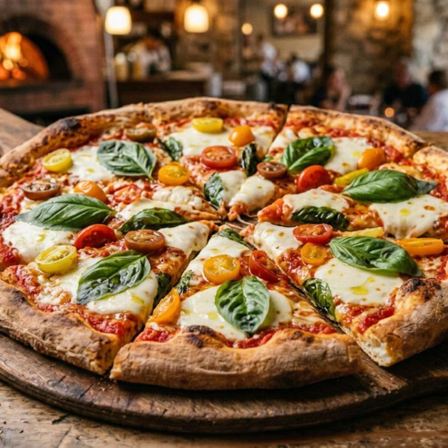 Elaborada con masa madre, queso mozzarella, albahaca, jitomate cherry, aceite de oliva y salsa napolitana