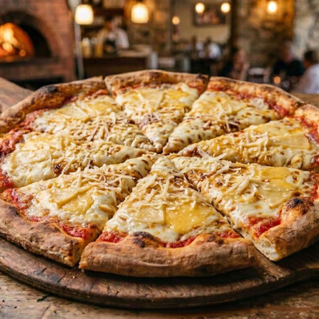 Elaborada con masa madre, queso mozzarella, salsa napolitana, queso cheddar, queso manchego y queso parmesano
