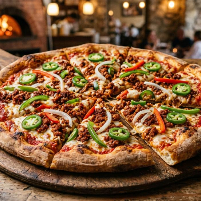 Elaborada con masa madre, queso mozzarella, salsa napolitana, cebolla, pimientos, chorizo y jalapeños.