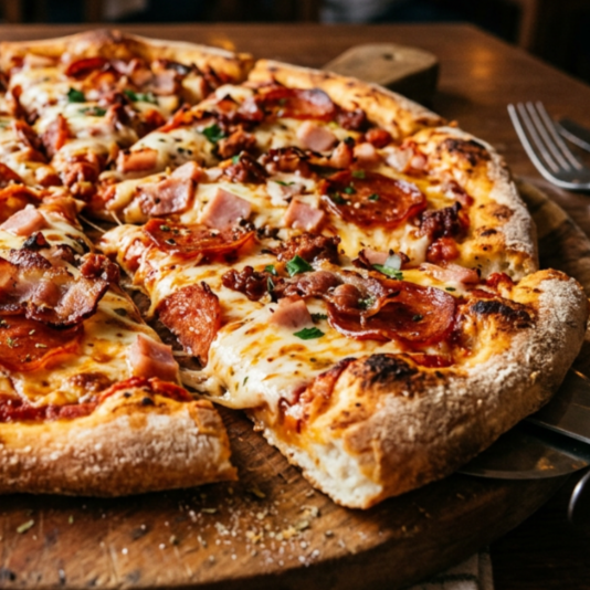 Elaborada con masa madre, queso mozzarella, salsa napolitana, chorizo, jamon, peperonni y tocino.