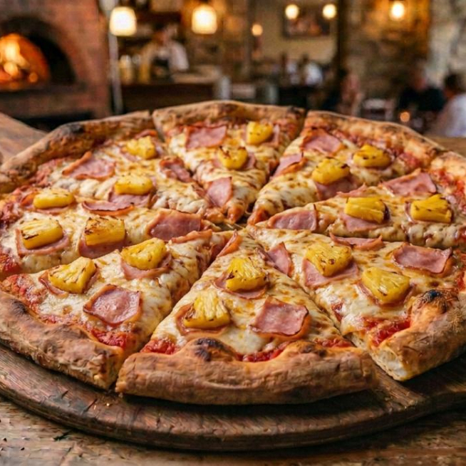 Elaborada con masa madre, queso mozzarella, salsa napolitana y piña con jamón