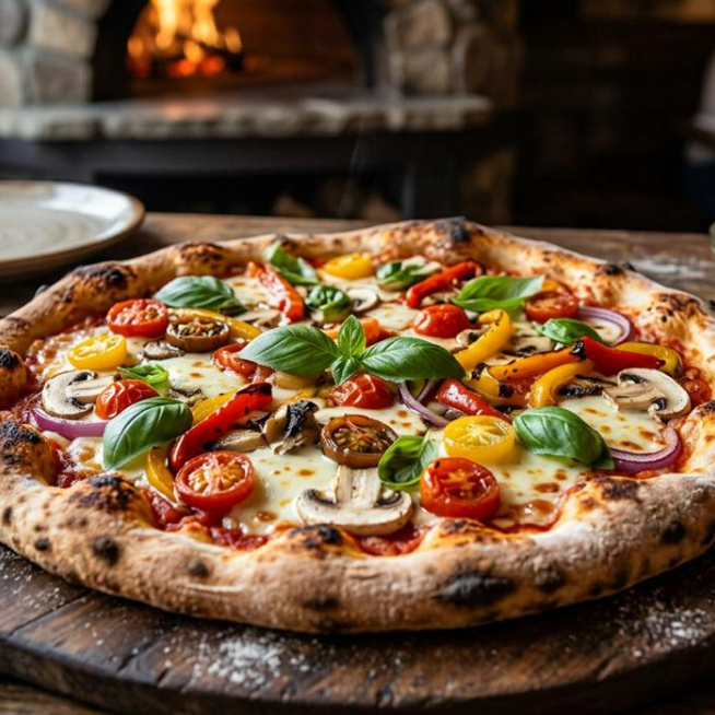 Elaborada con masa madre, queso mozzarella, salsa napolitana, pimientos, cebolla, champiñones y albahaca