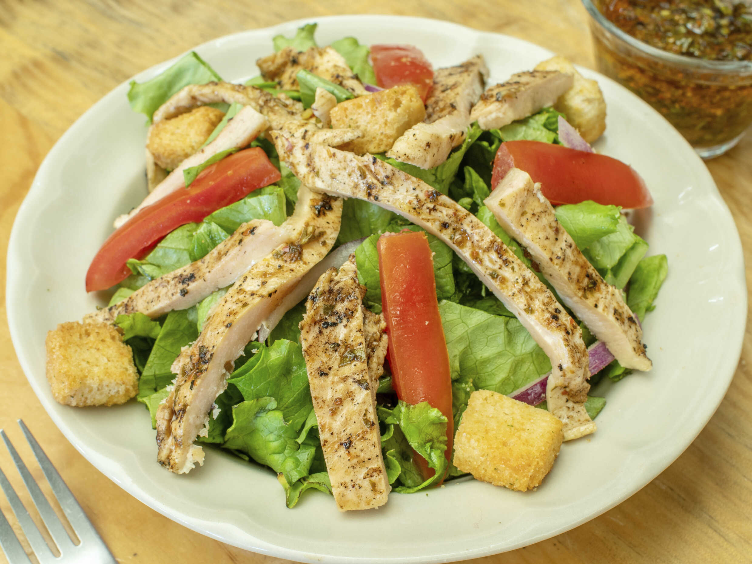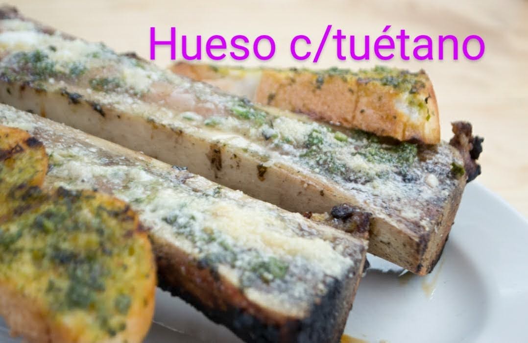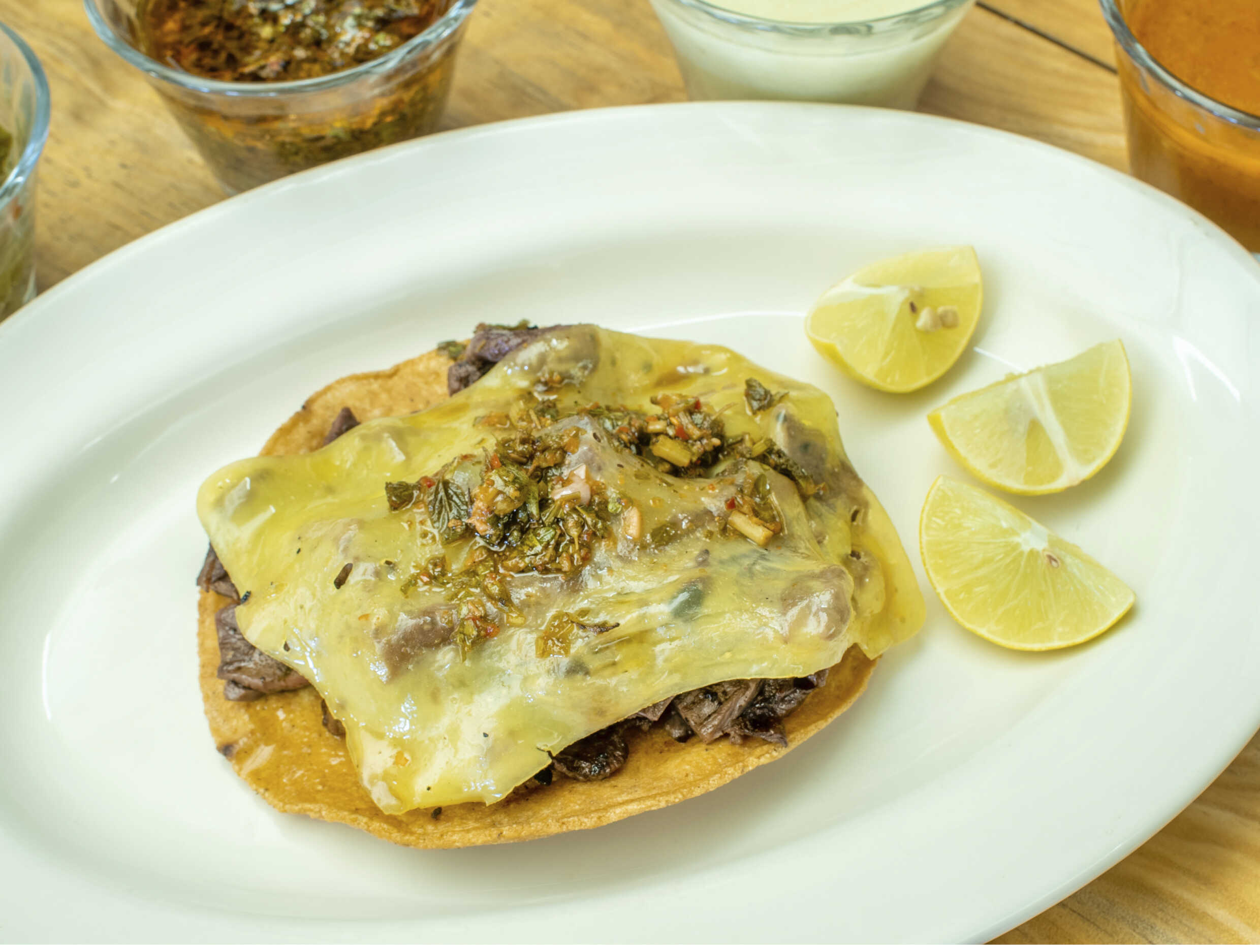 Tostada con arrachera, chistorra y queso con chimichurri.