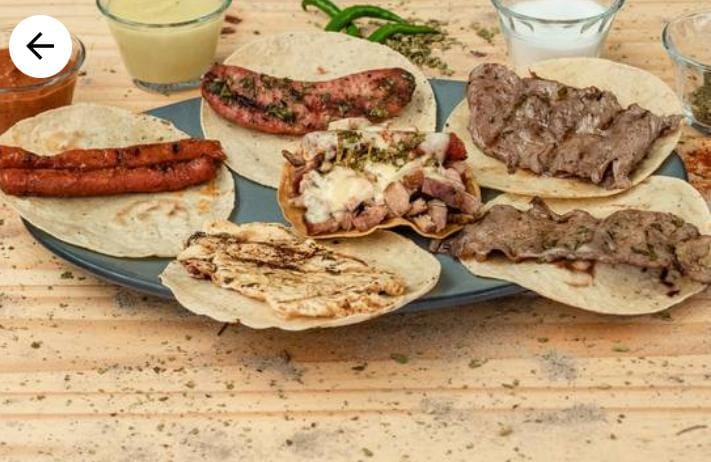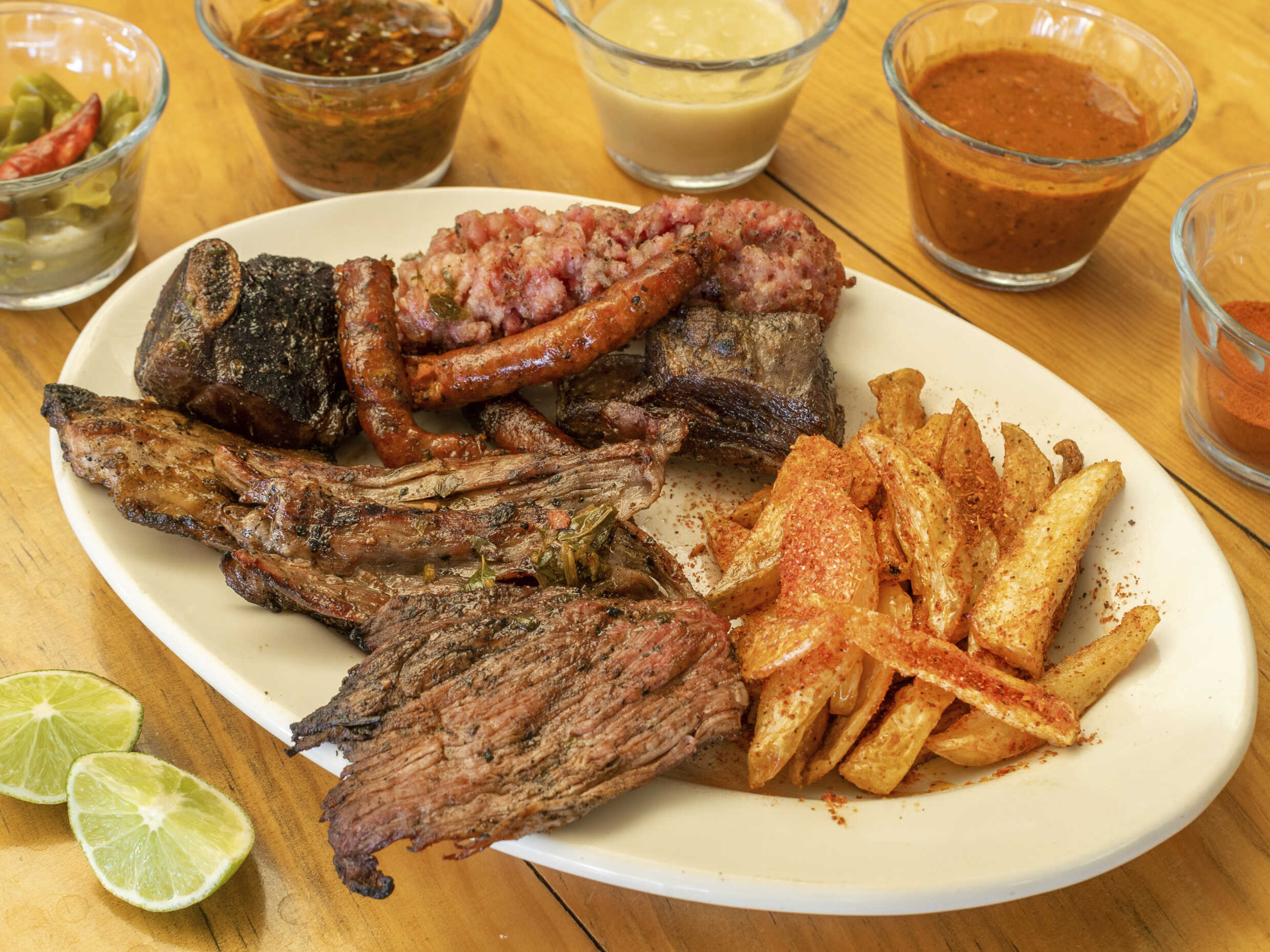 Asado de tira, pecho, costilla, arrachera, chorizo argentino, chistorra. Incluye salsas, nopales, tostadas, tortillas de comal, ensalada y papas.