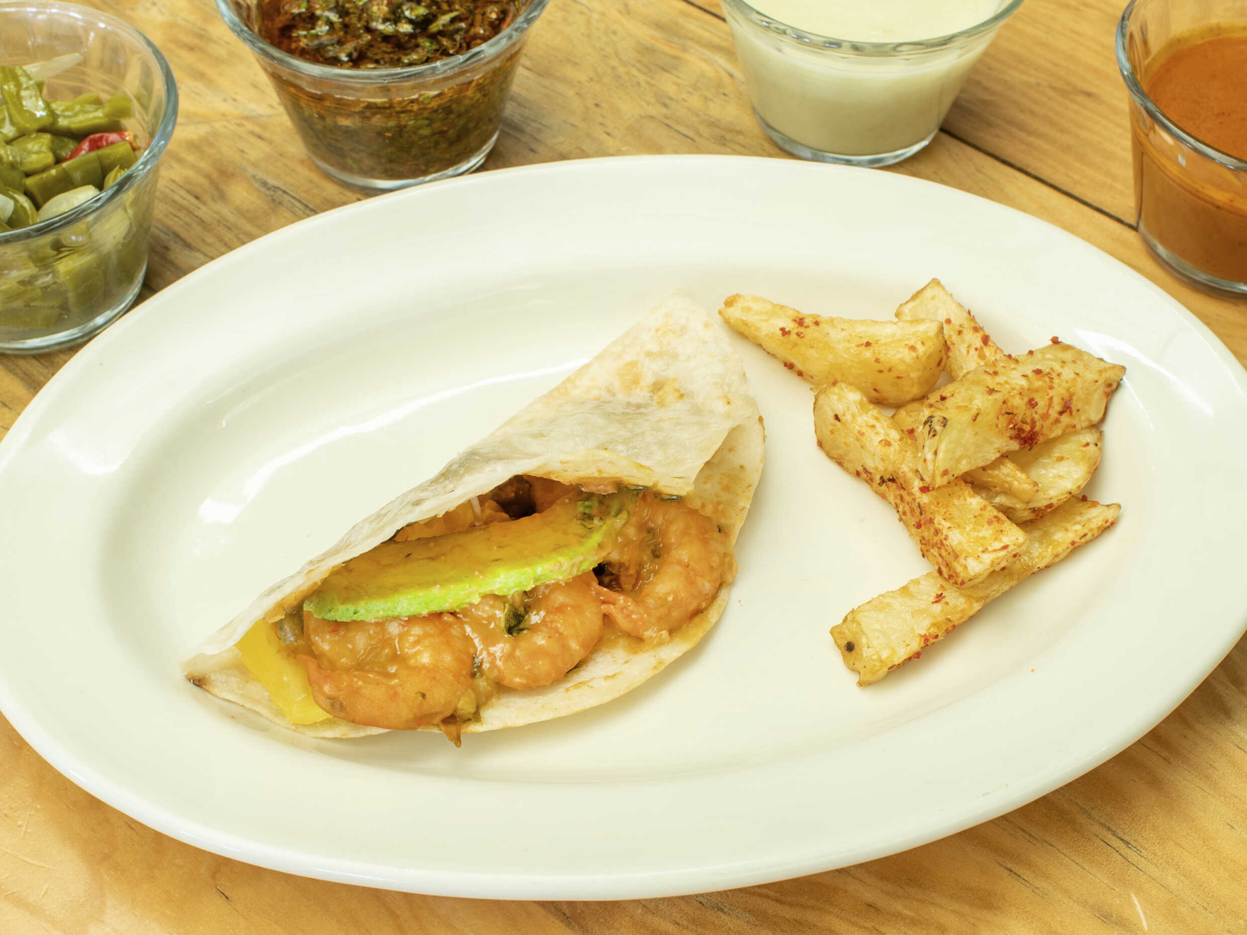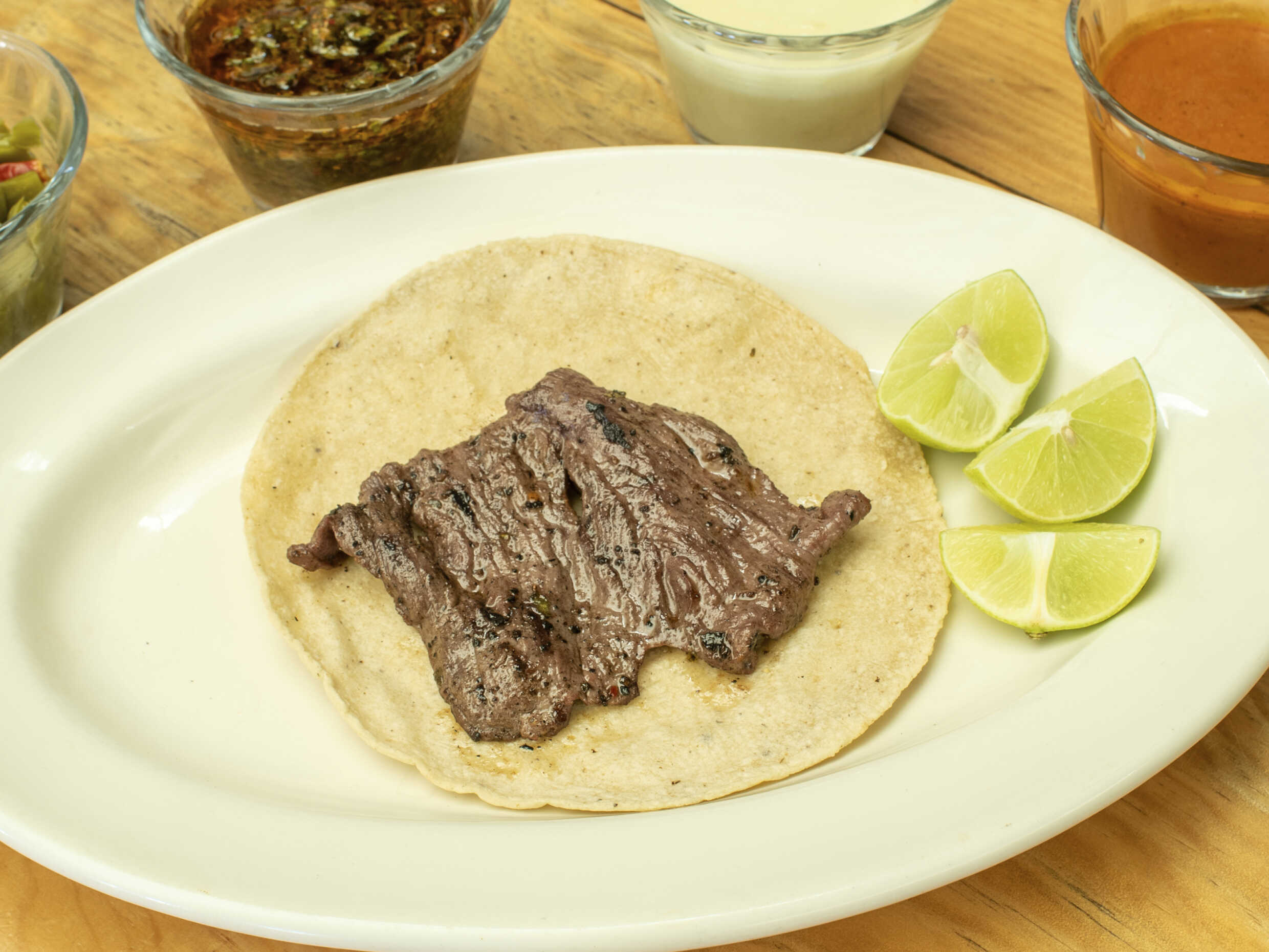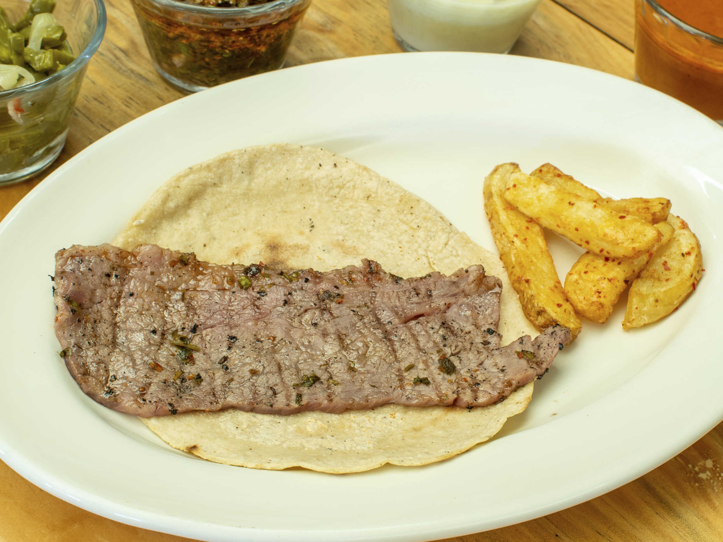 una tortilla de maiz + una capa de queso con una capa de chile jalapeño y arrachera