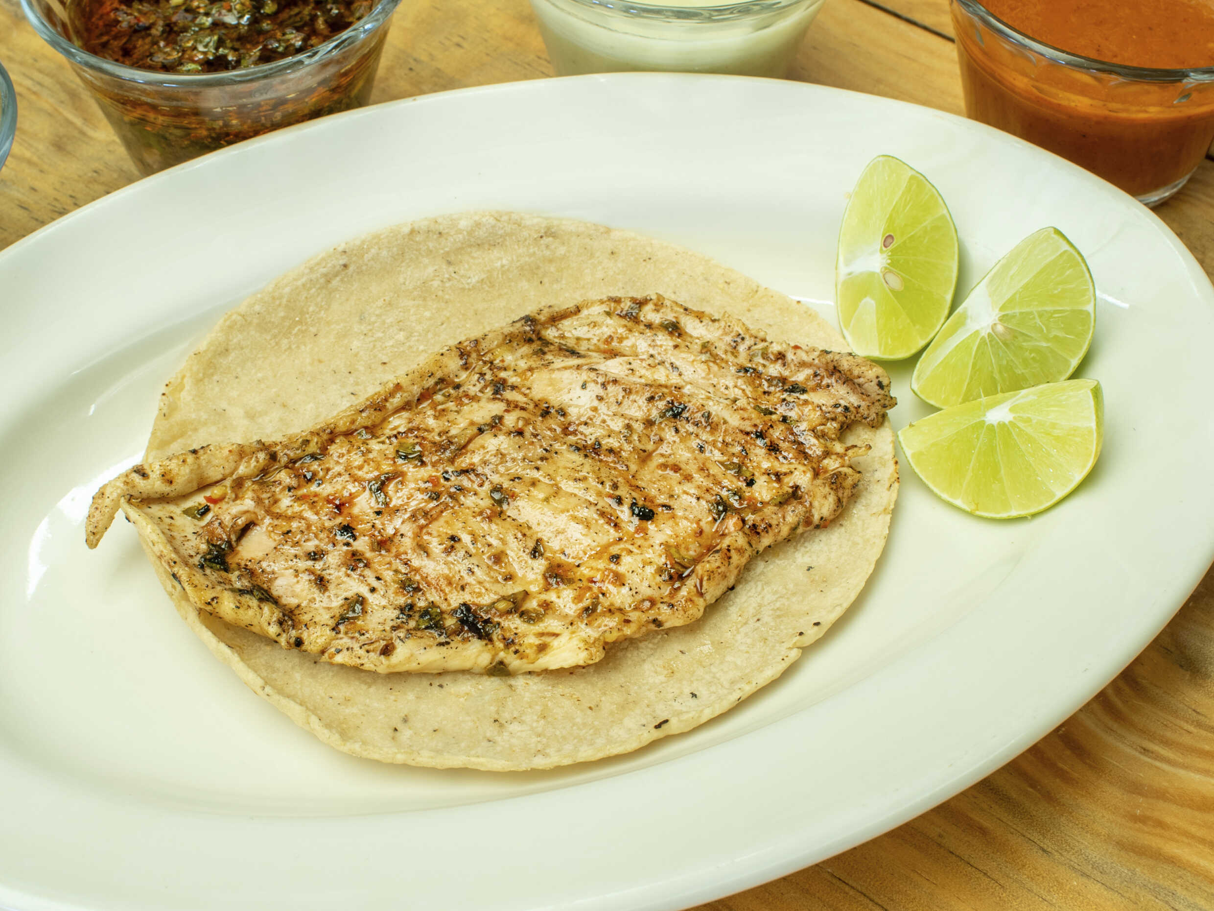 una tortilla de maiz + una capa de queso con una capa de chile jalapeño y pecho