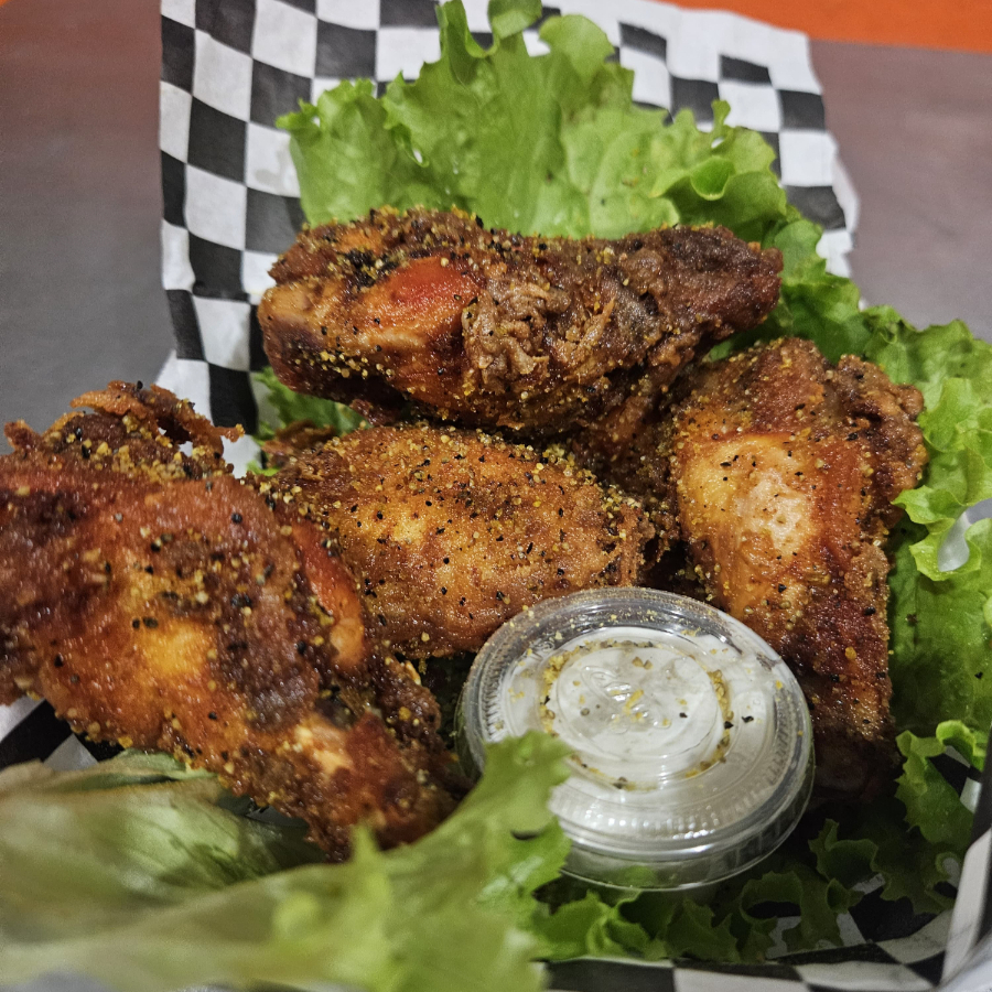 Orden de 6 alitas sobre una cama de lechuga, bañada en su salsa favorita y acompañadas de 1 onza de aderezo ranch