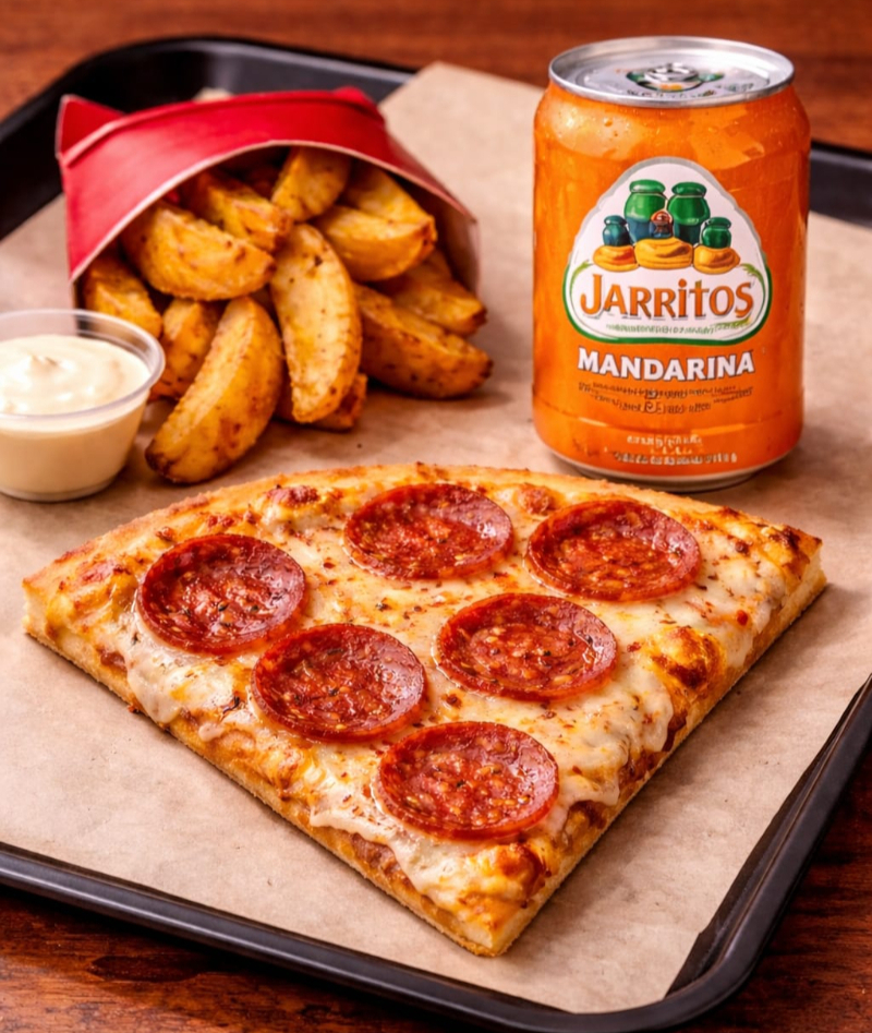 1 Pizza jumbo, 1 orden de papas 280 gr, contiene cátsup, salsa Valentina y queso amarillo los cuales se ponen a parte, 1 refresco de 2 Lt.
