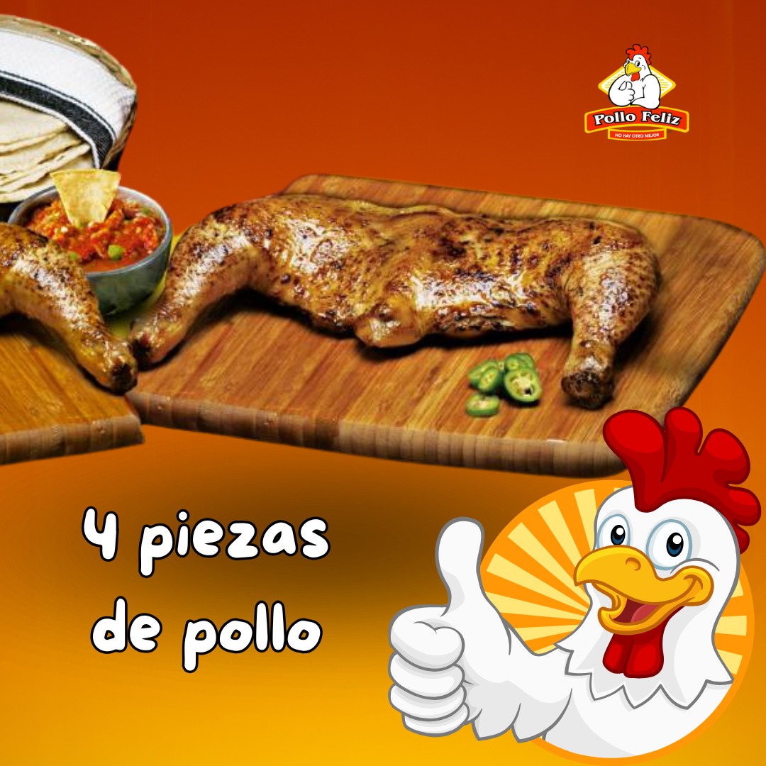 4 Piezas 2 piernas 2 muslos. Incluye salsa, 4 tortillas hechas a mano, chiles, cebolla asada y totopos.