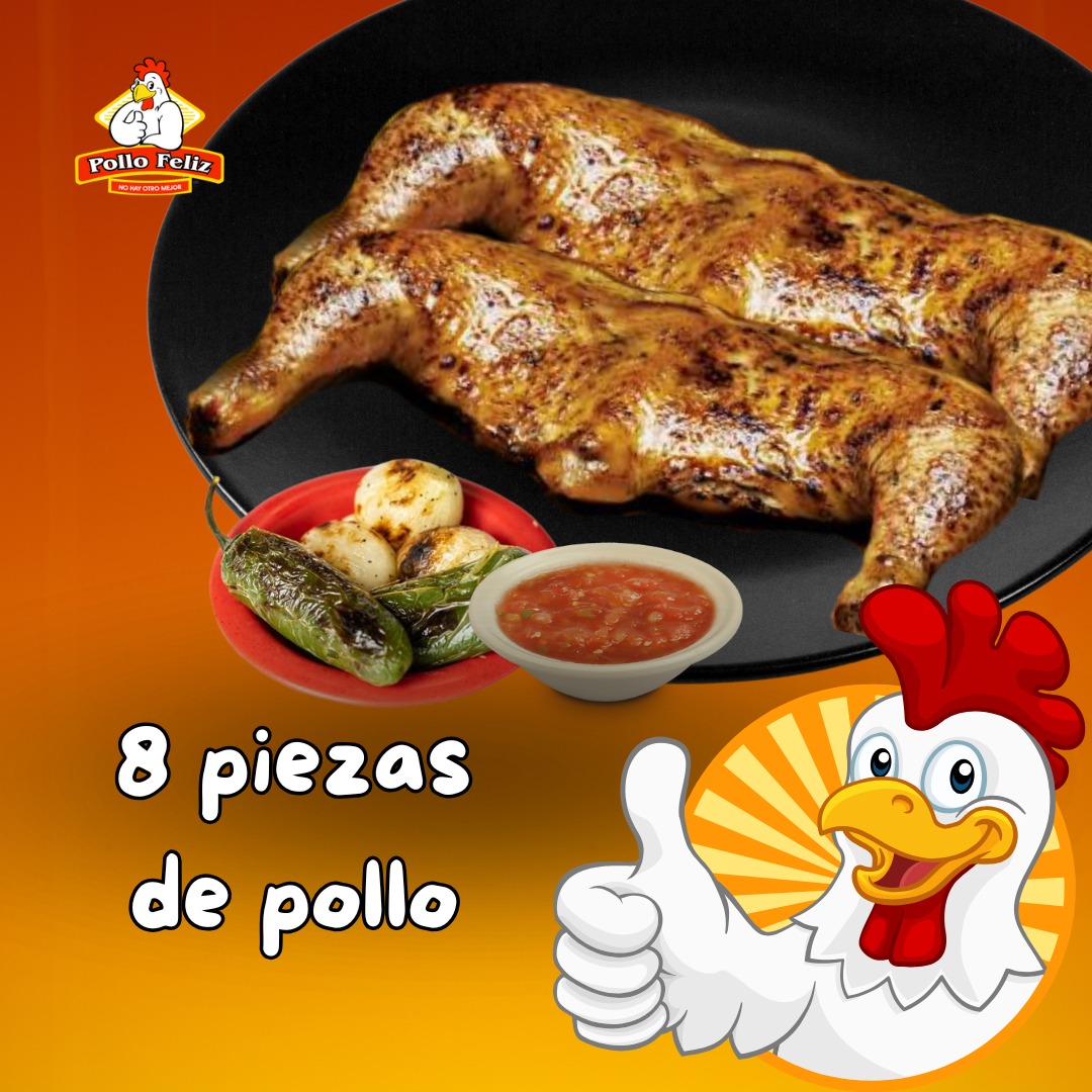 8 Piezas 4 piernas 4 muslos, incluye salsa, tortillas hechas a mano, chiles, cebolla asada y totopos, 1 salsa, 2 tortillas, 1 chile asado.