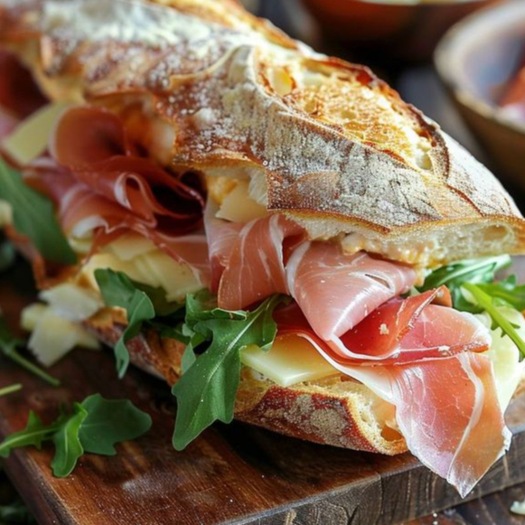 Mayonesa artesanal de ajo, cebolla caramelizada, jitomate confitado, jamon serrano y queso doble crema.