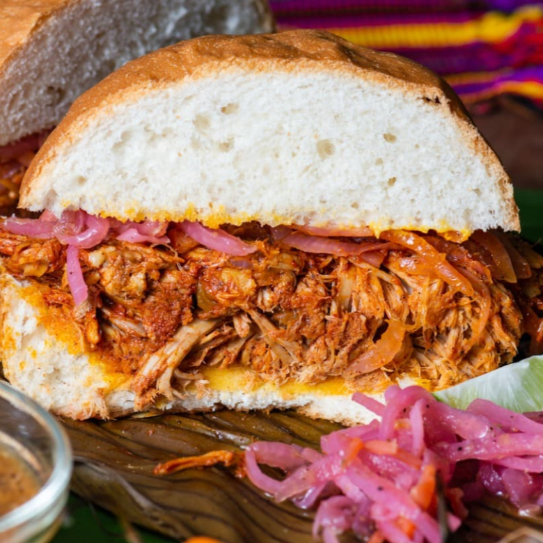 Base de frijoles refritos, cochinita, cebolla encurtida con abanero, mayonesa artesanal