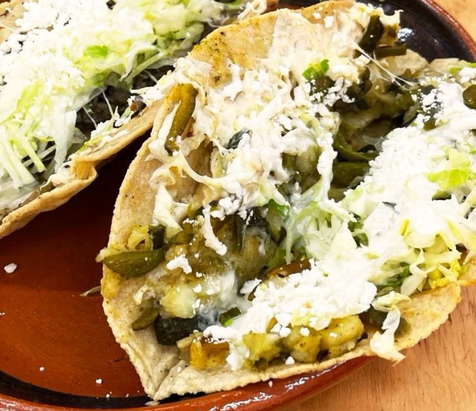 Orden de 4 tacos servidos con lechuga, crema, aguacate y queso rayado.
