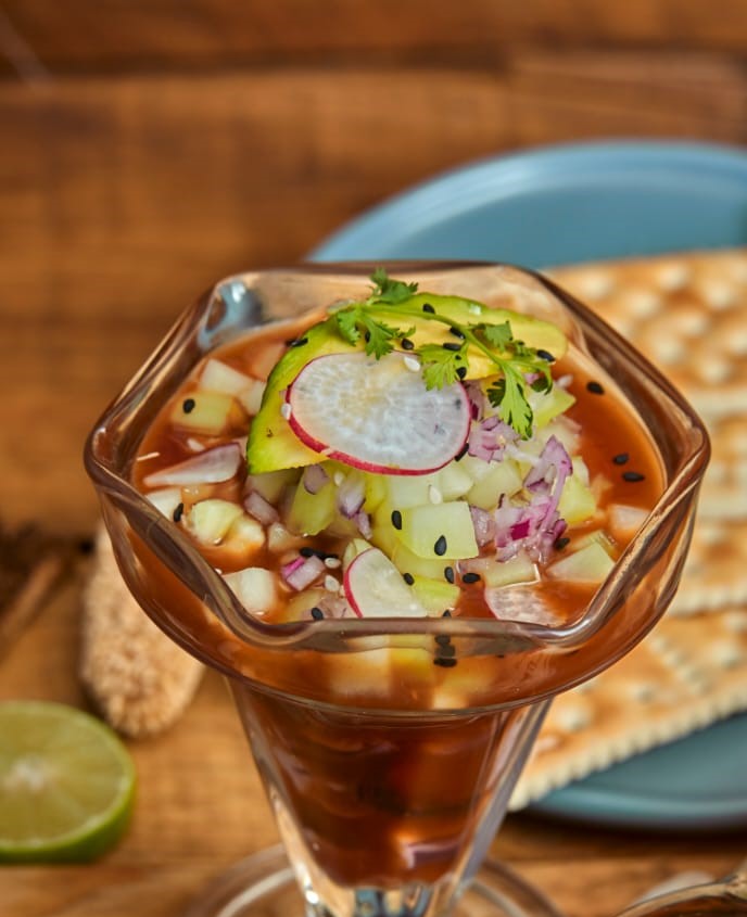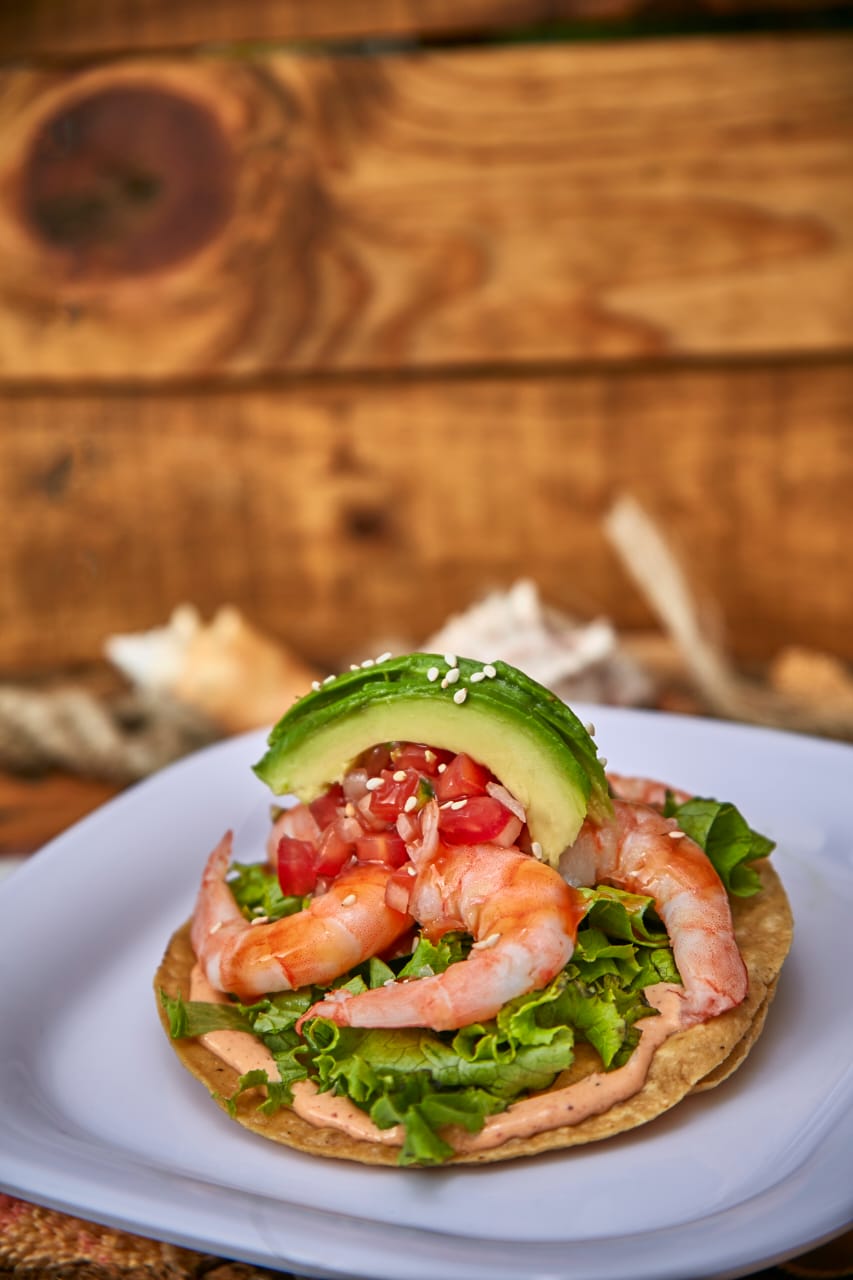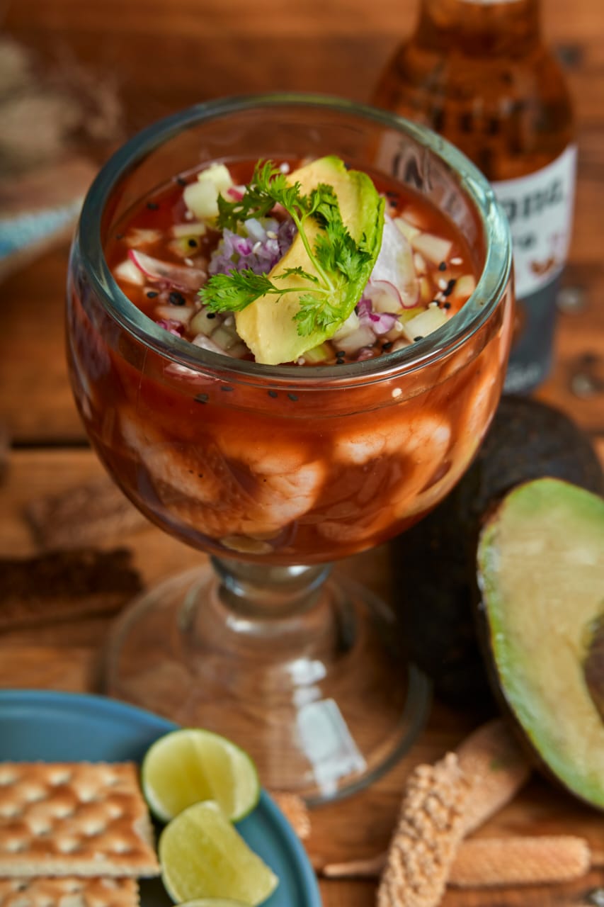 Camarón crudo y cocido, jitomate, cebolla, pepino y aguacate.