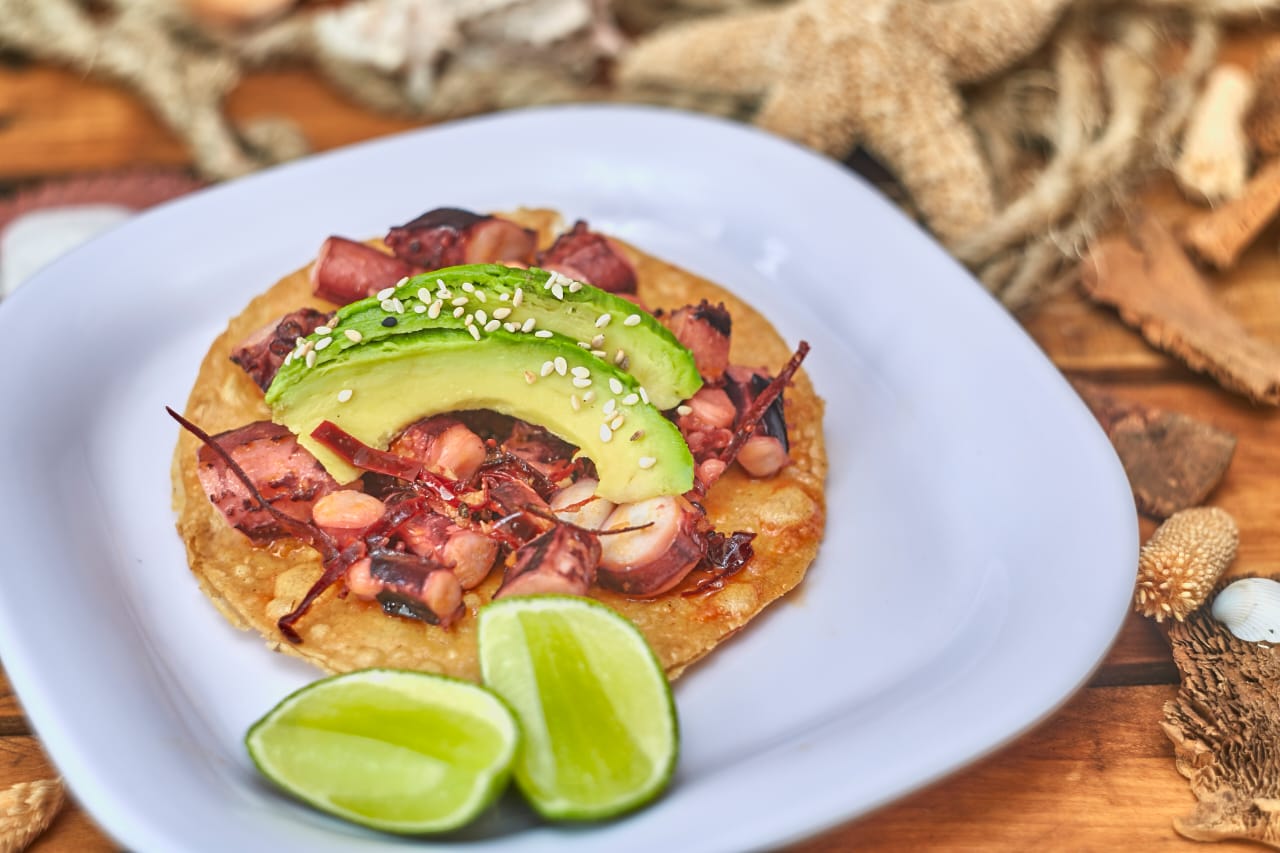Arrachera, pulpo, camarón, queso, crema, frijoles y pico de gallo.
