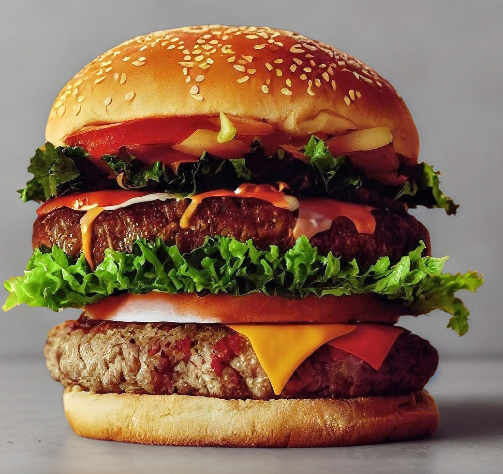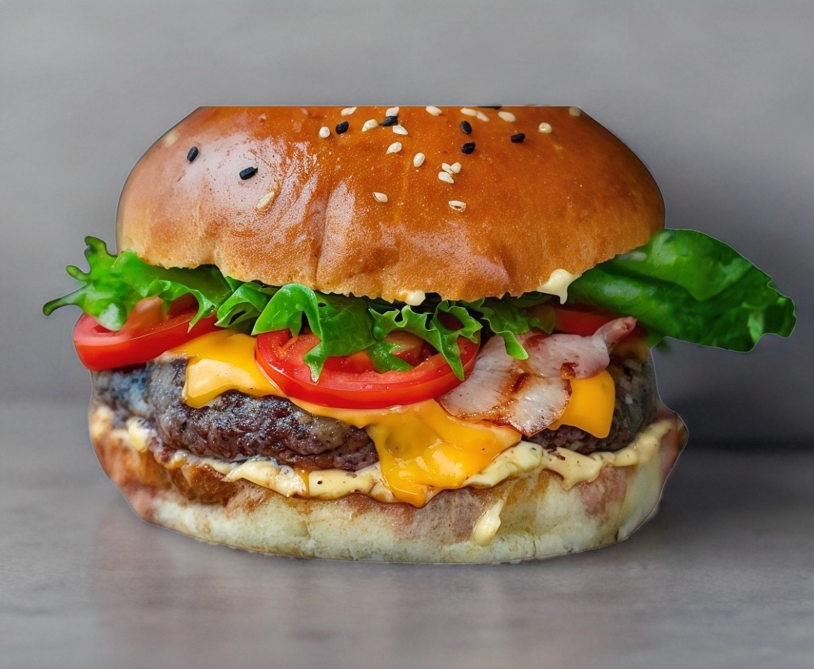 Hamburguesa de res con doble carne, jamon, Q. amarillo, Q. oaxaca, Tocino, Salchicha.