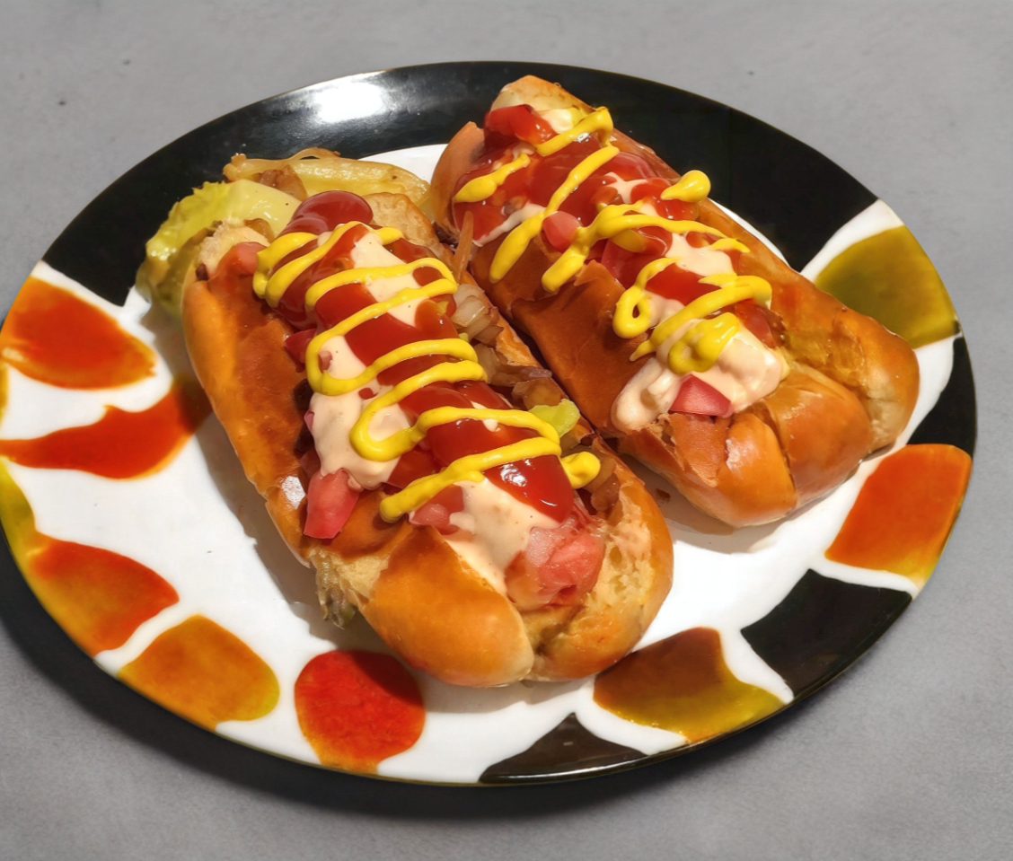 Pan grande, doble Salchicha, tocino, Queso gratinado queso amarillo, verdura