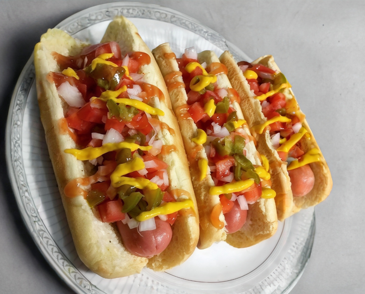 3 piezas de hotdog, con jiotomate, cebolla y chile
