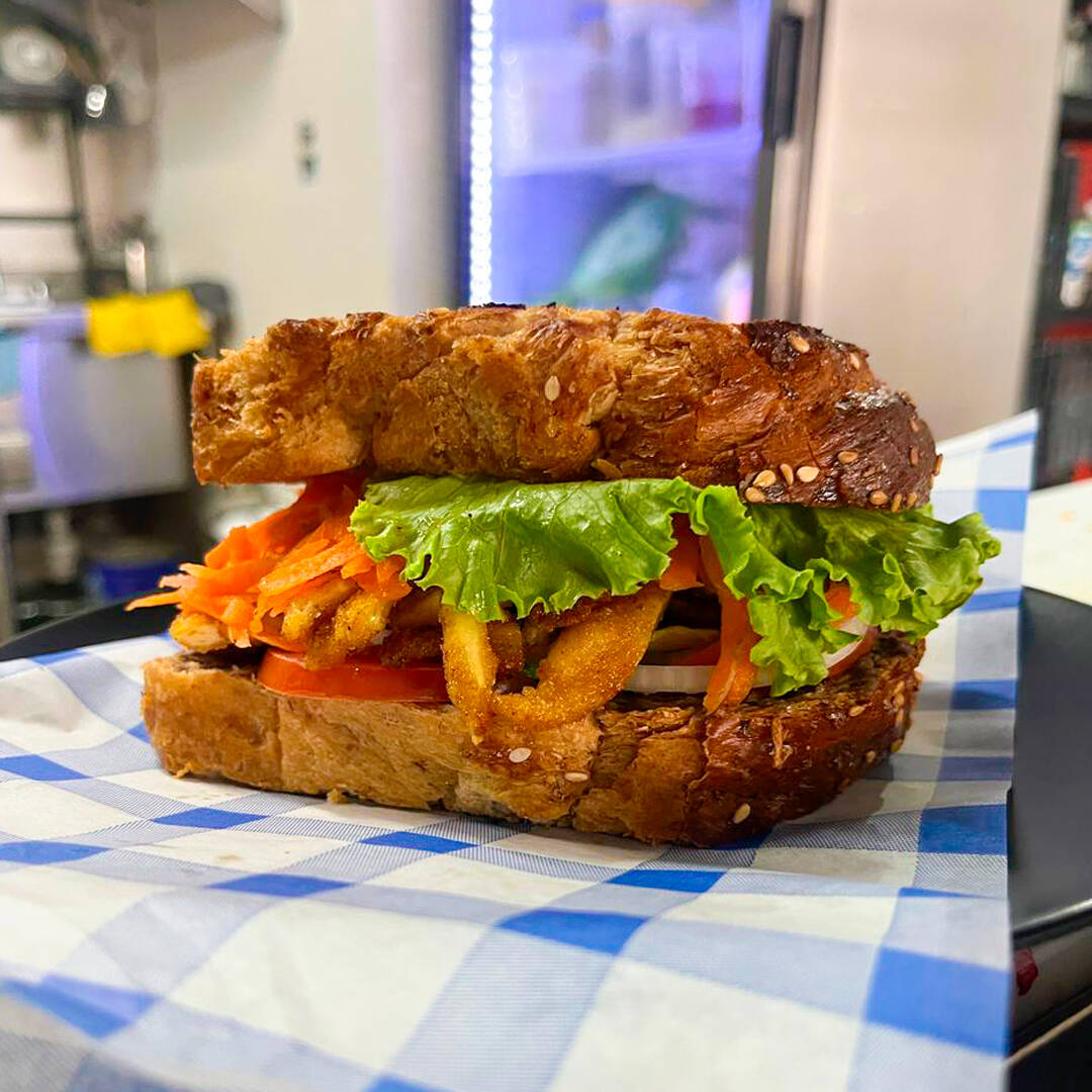Pan Integral Artesanal, 1 capa de Mayonesa, base de Frijoles, Lechuga, Zanahoria rayada, lechuga, Germen de Trigo