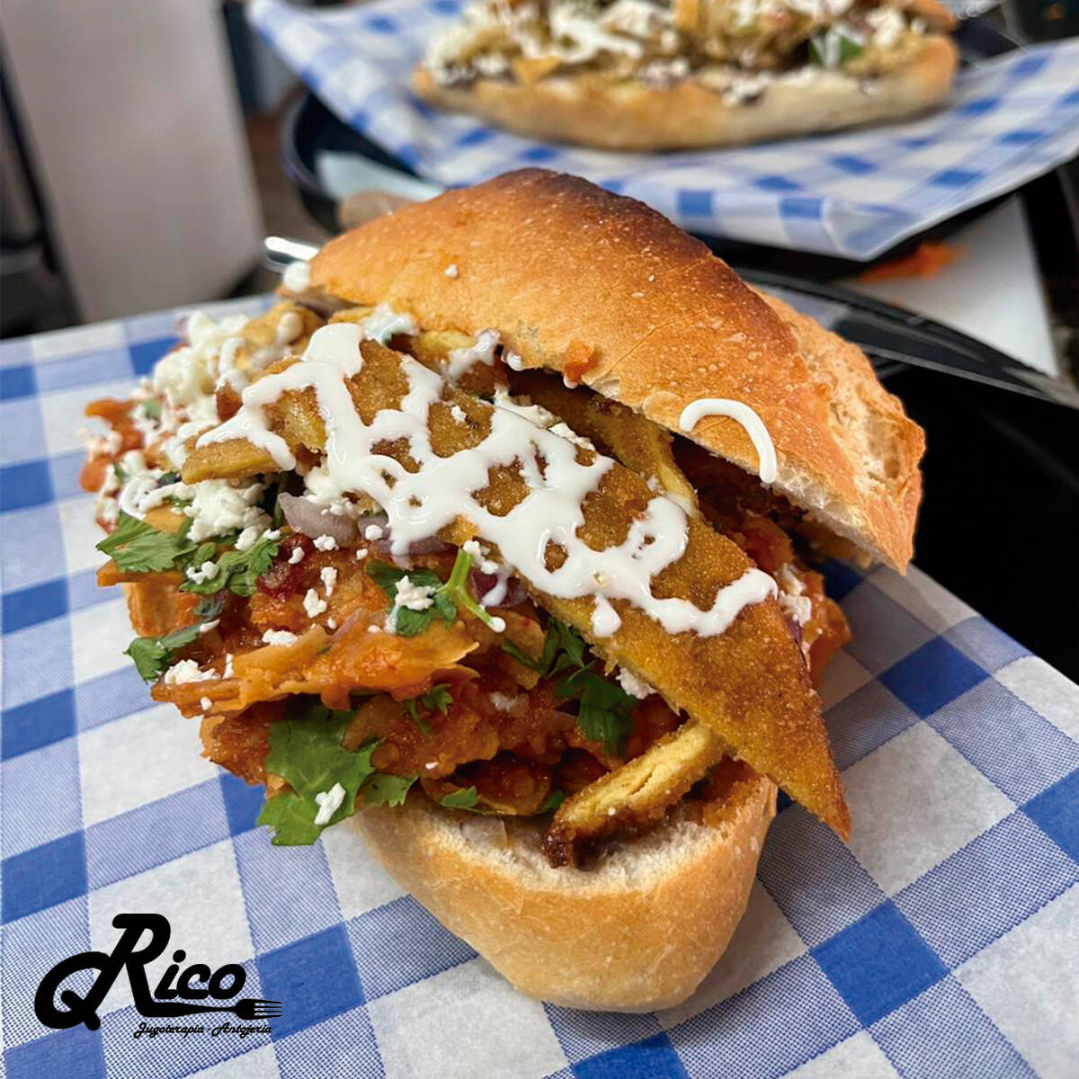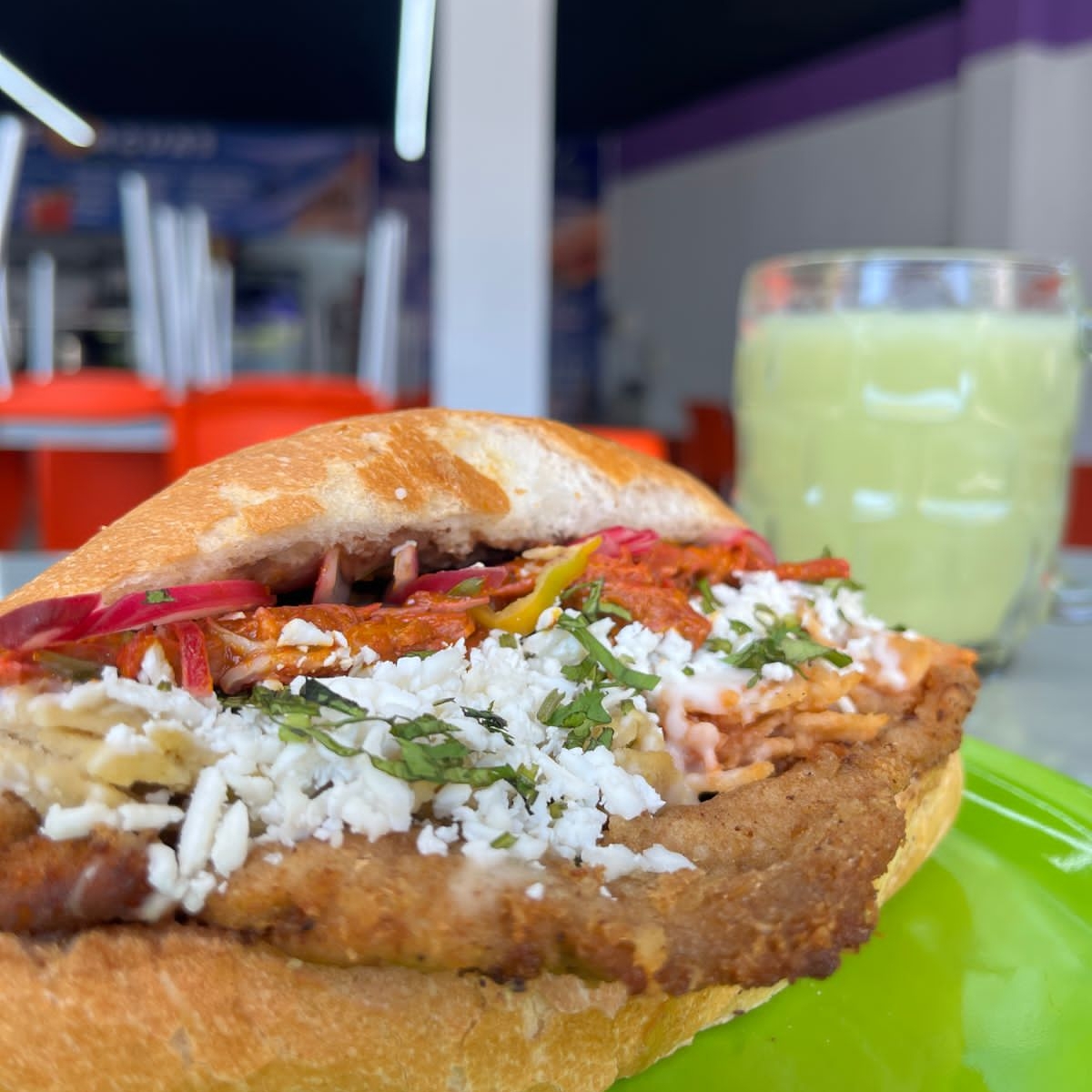Torta de chilaquiles Verdes o Rojos (o combinados) con milanesa de pollo y Rica Cochinita, acompañada con queso, crema y cebolla morada (Opcional)