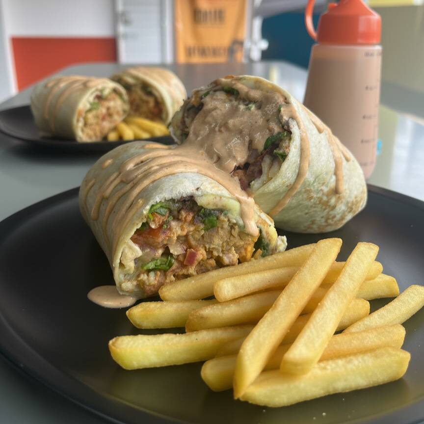 Tortilla de Harina Grande, Proteína de su elección, Arroz, Frijoles, Guacamoles, Cebolla Morada, Pico de Gallo