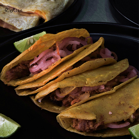 4 piezas. Tortillas Hechas a mano remojadas en adobo, Rica Cochinita Pibil, Cebolla morada con habanero