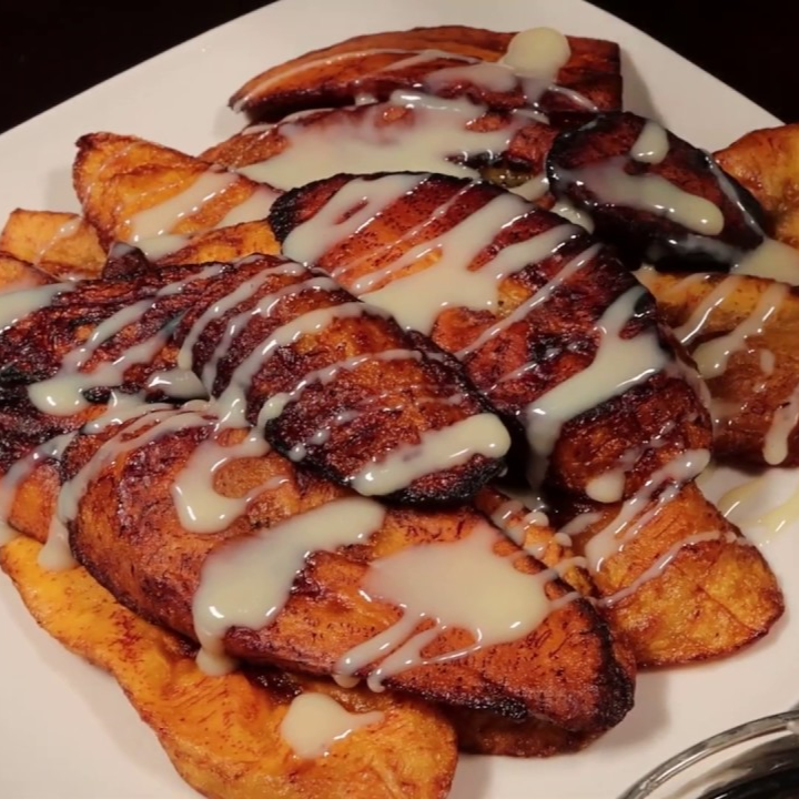 Plátanos machos fritos preparados al momento con canela y lechera de la casa.
