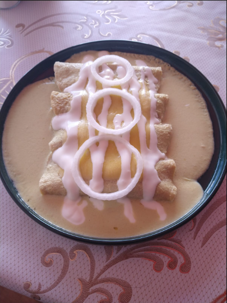 4 Enchiladas verdes rellenas de pollo, lechuga, queso, crema, arroz y frijoles.
