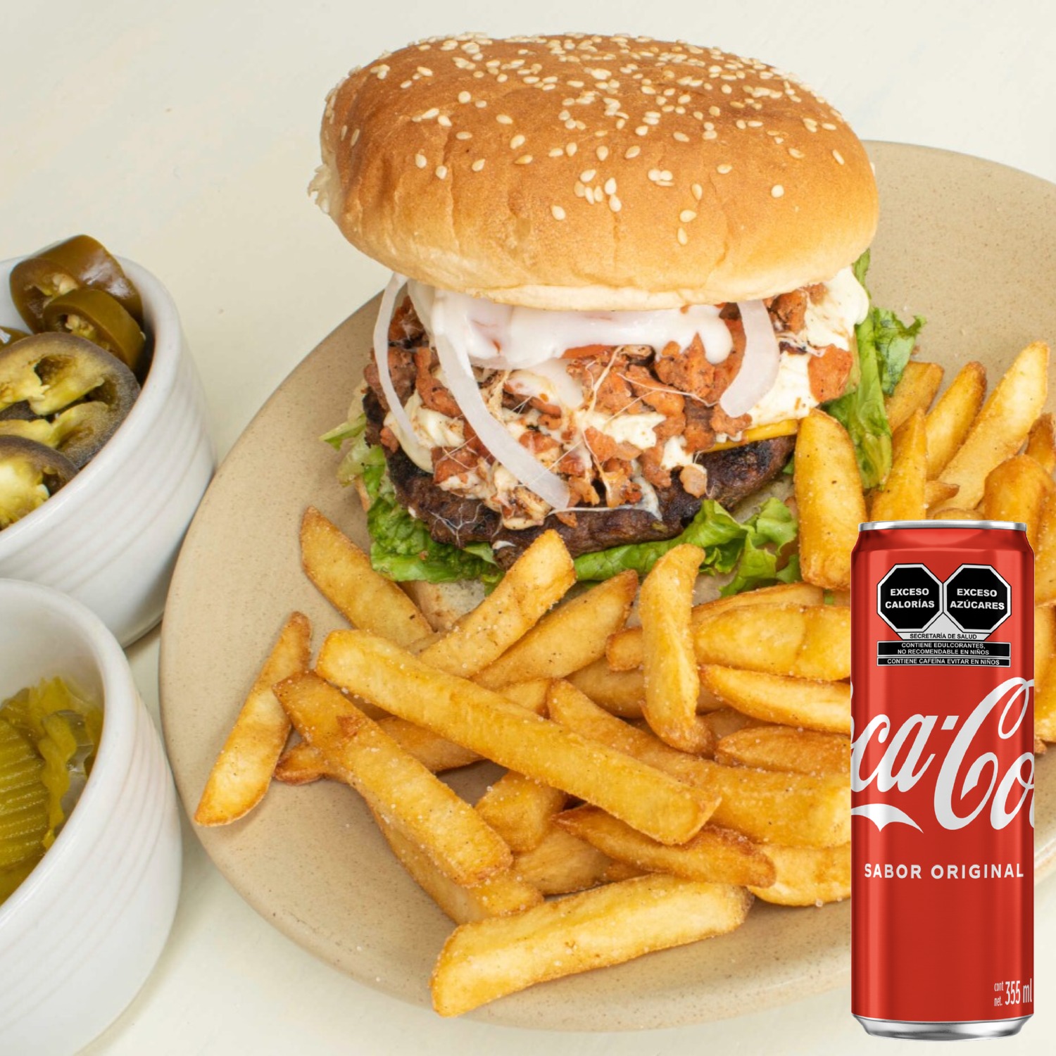 Elige tu hamburguesa, incluye refresco Coca Cola 355 ml