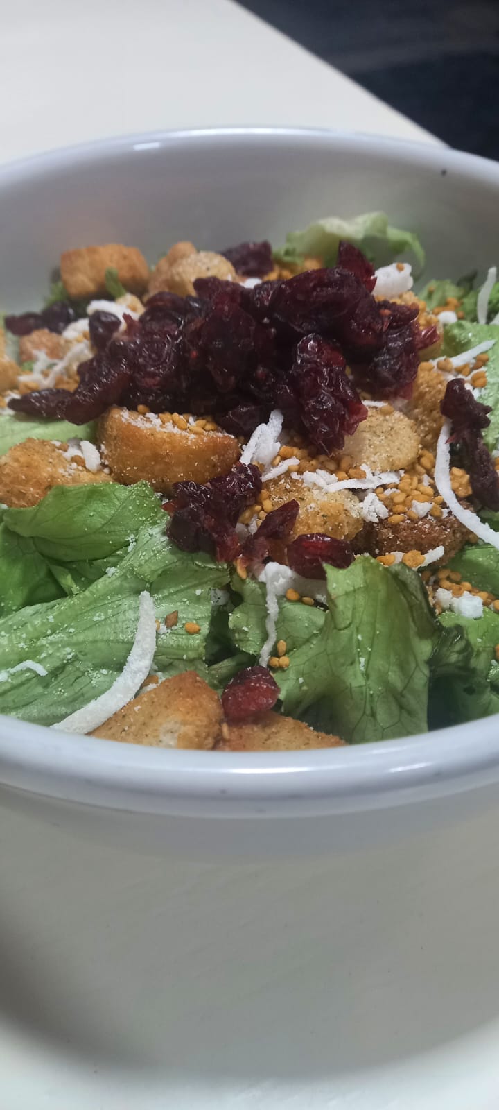Mix de lechugas, coco, arándano, ajonjolí dulce, crutones y aderezo.