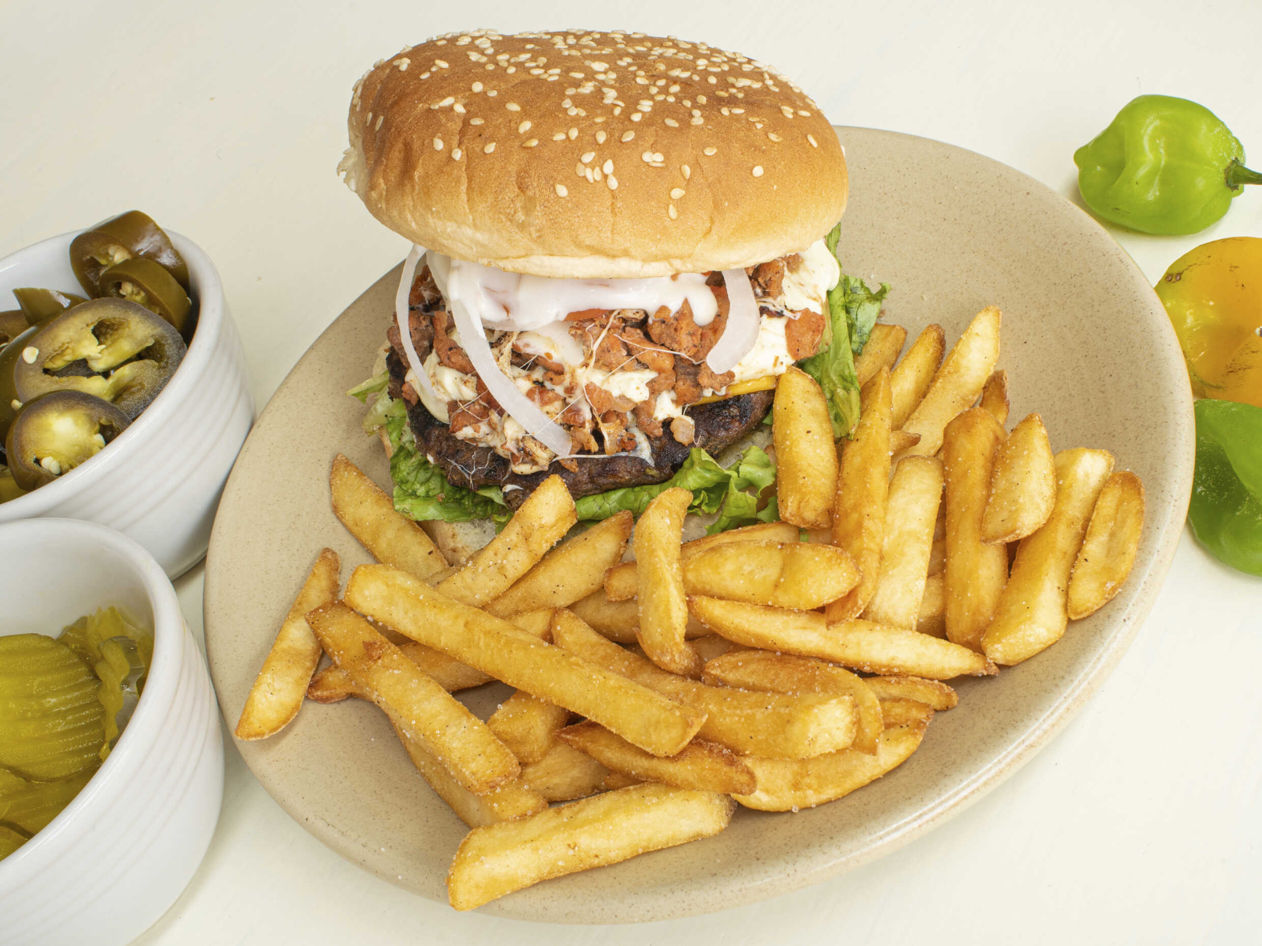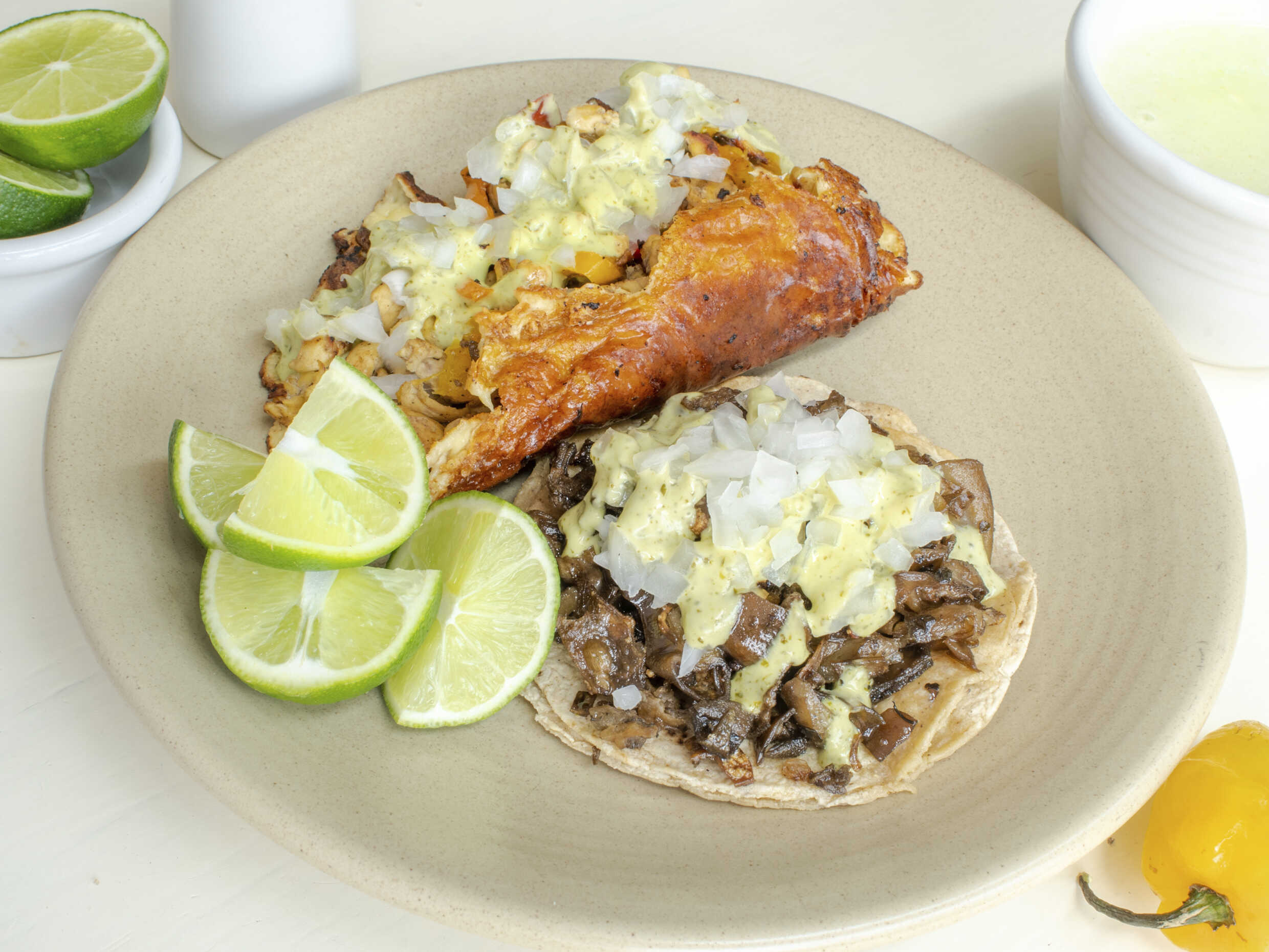 Bistec, queso Oaxaca, pimientos, aderezo de cilantro y cebolla.