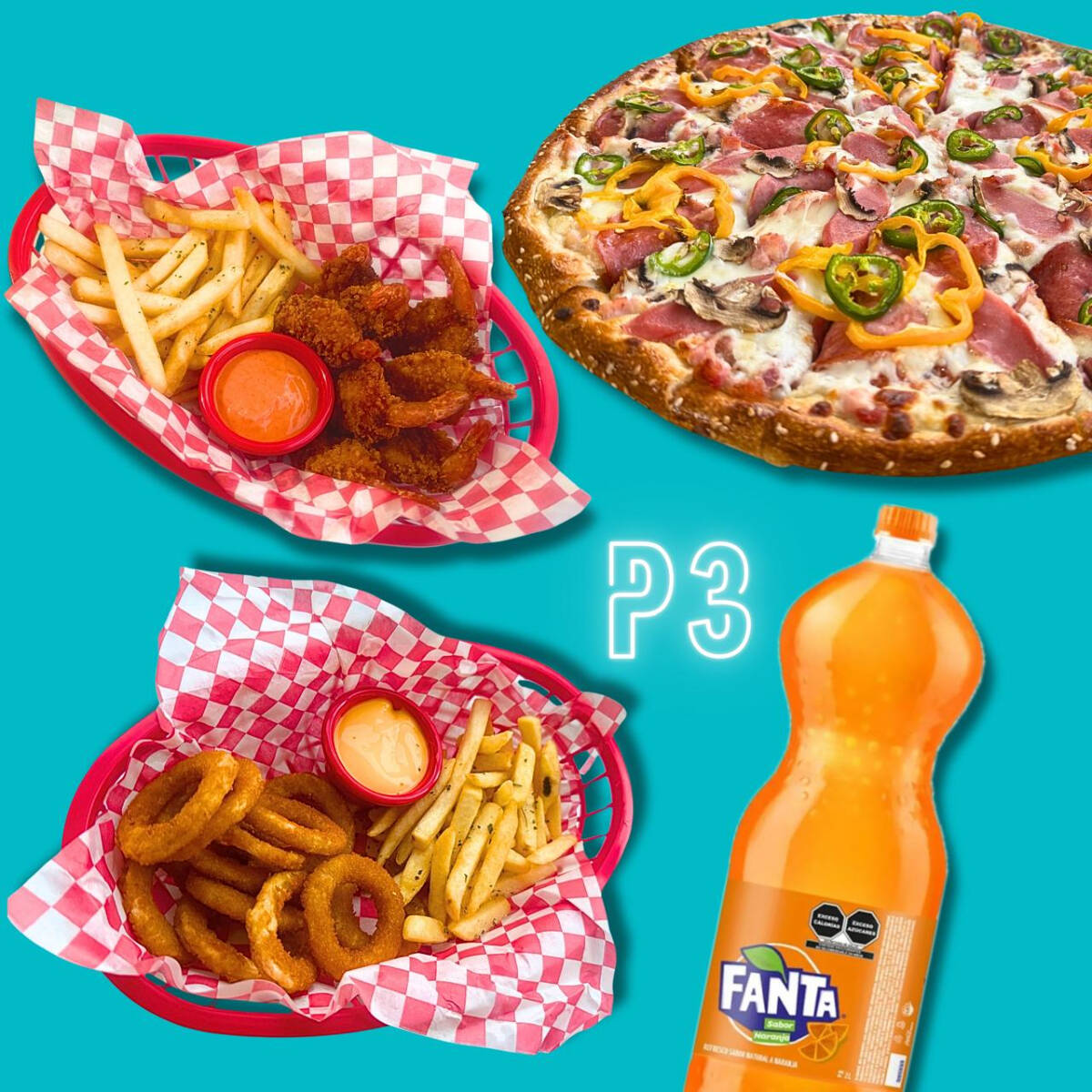 Pizza familiar + Camarones Empanizados + Aros de cebolla + Refresco de 2lt sabor