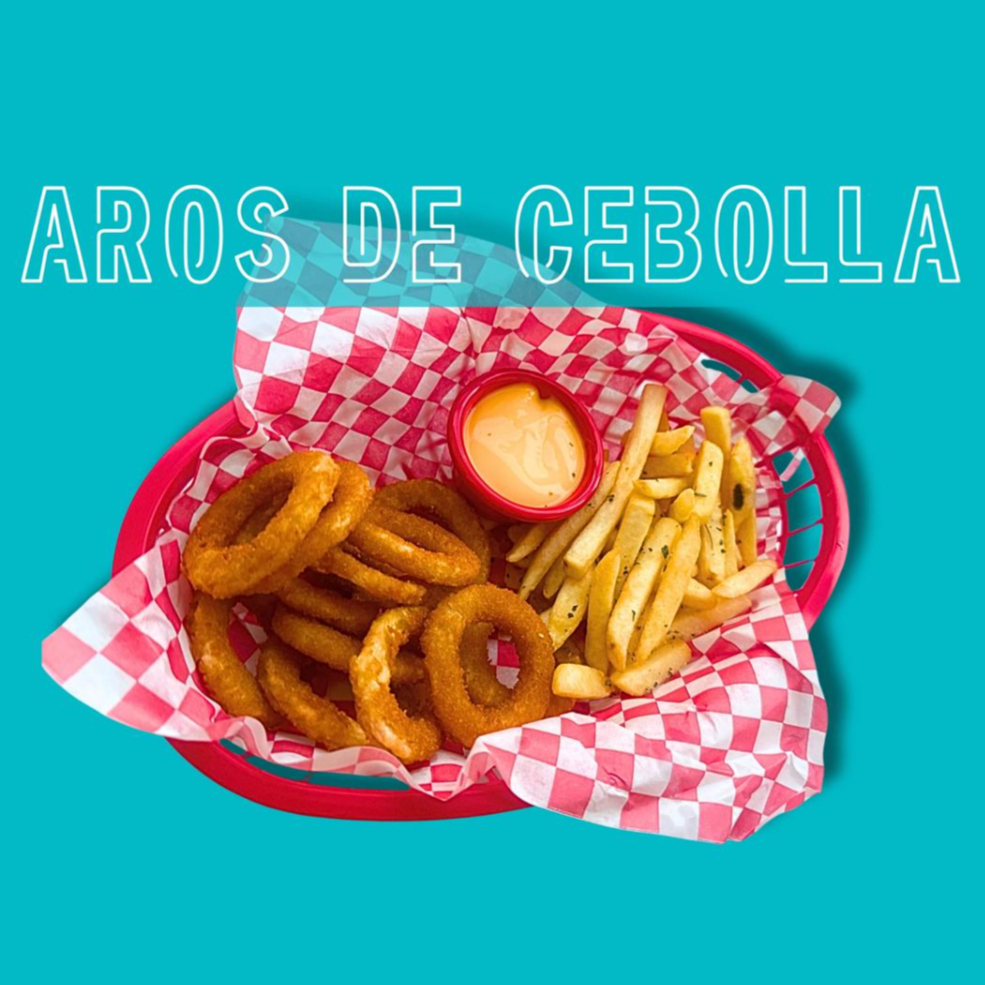 12 Pz de aros de cebolla acompañados de papas.