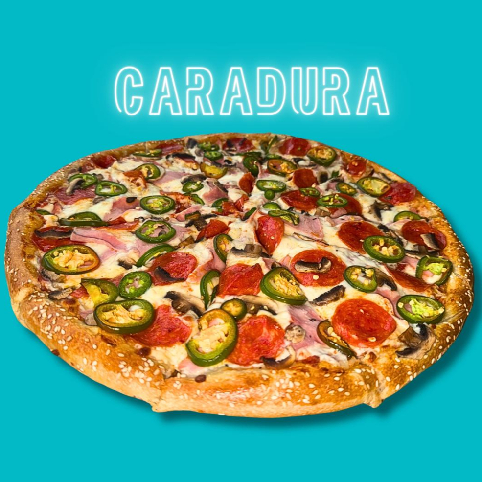 Salami, champiñon, tocino, pimiento mini, salchicha y jalapeño