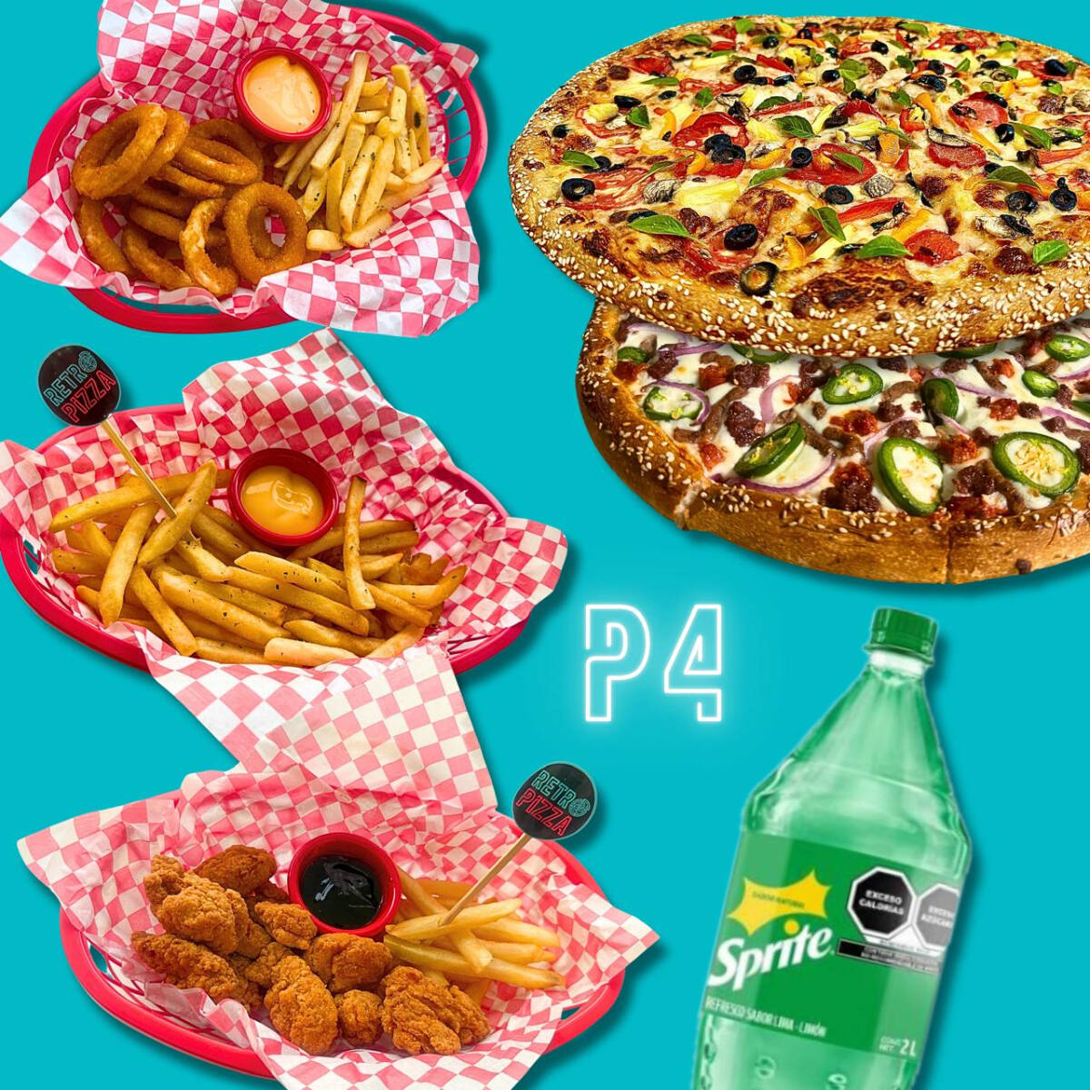 2 Pizzas Familiares + Boneless + Papas + Aros de cebolla + Refesco de 3 lt
