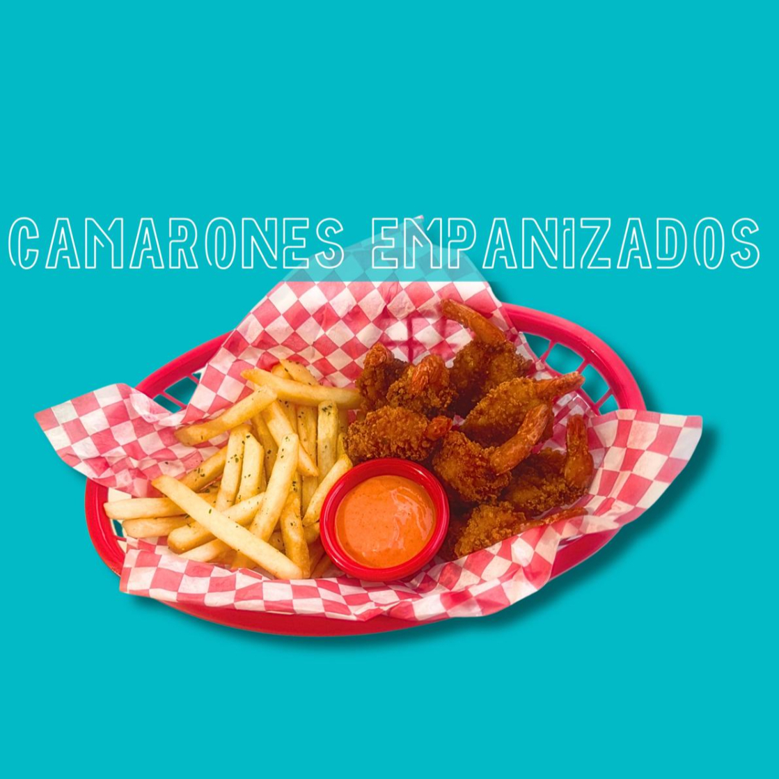 8 a 9 pz de camaron empanizado, acompañado de papas y aderezo cremoso.