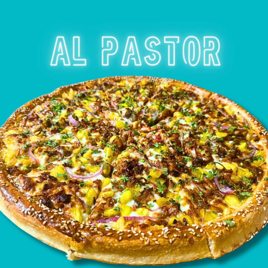 Carne al pastor de trompo, piña, cebolla morada y cilantro fresco.