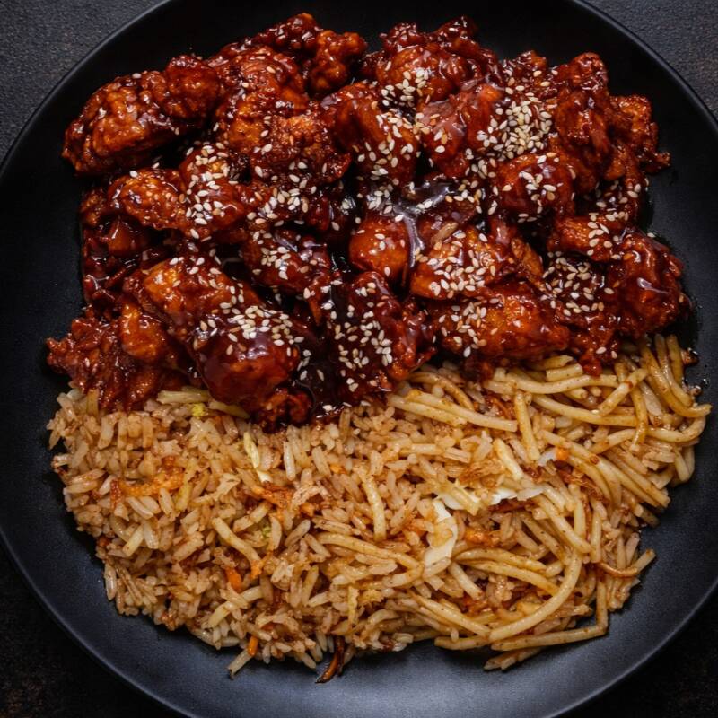 Pollo rebozado y frito en salsa dulce de naranja