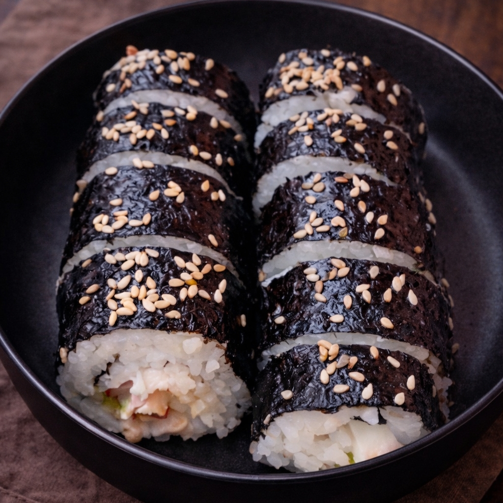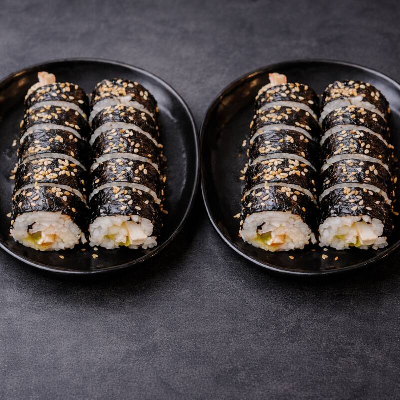 Alga nori rellena de arroz, surimi, pepino, zanahoria y queso crema